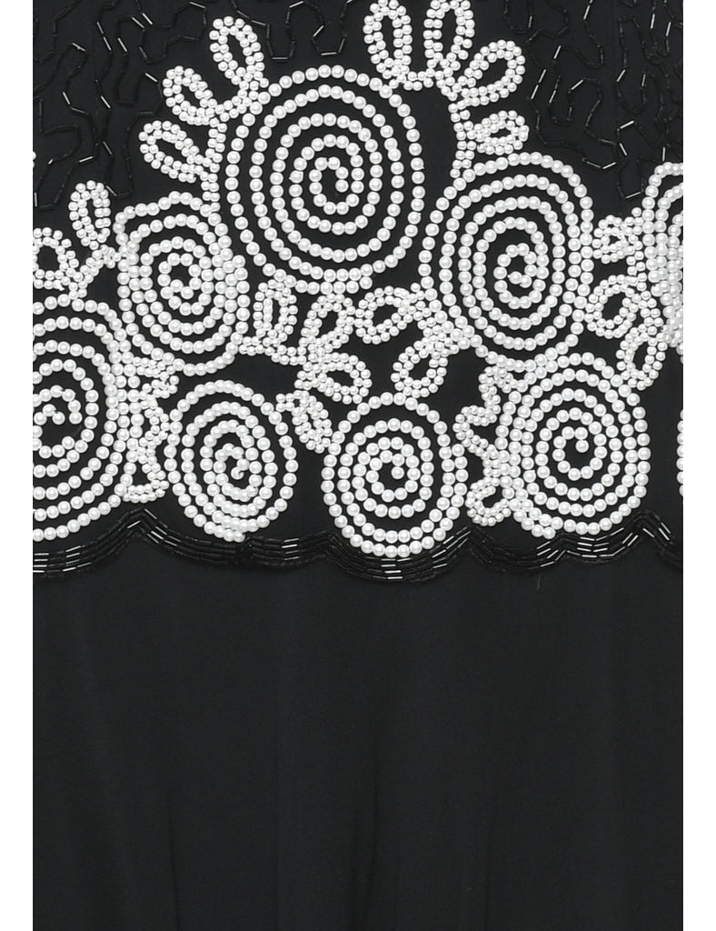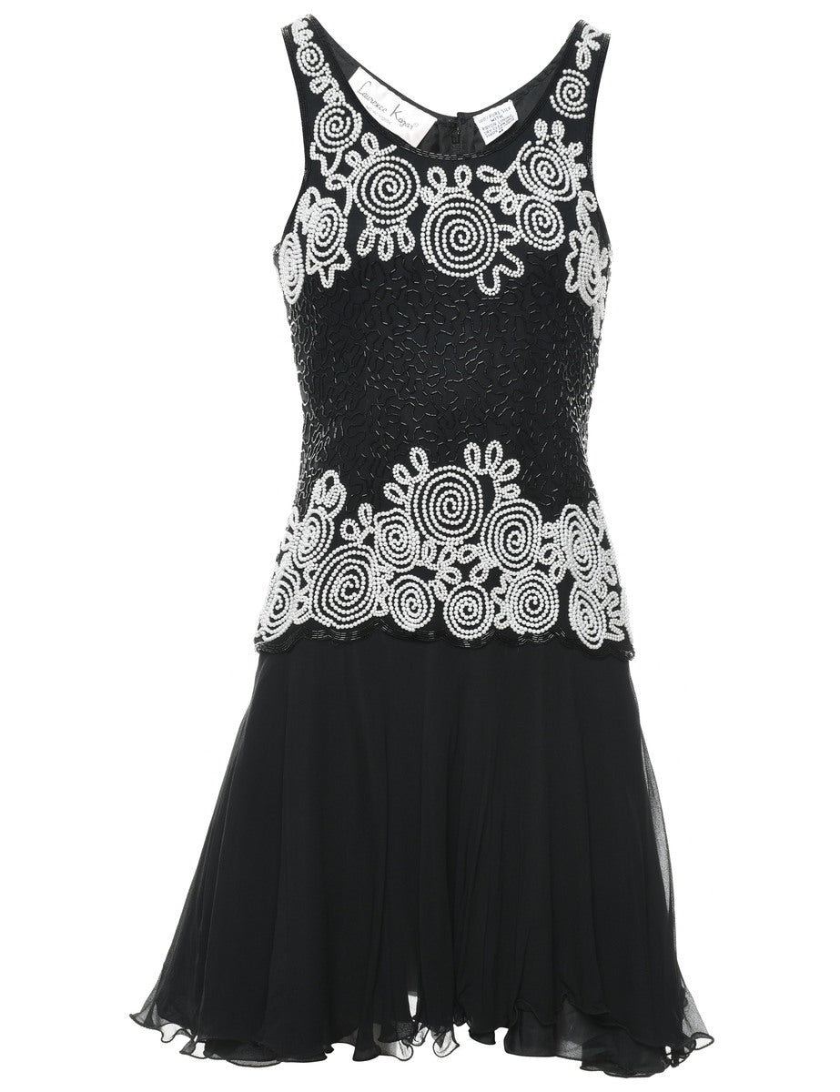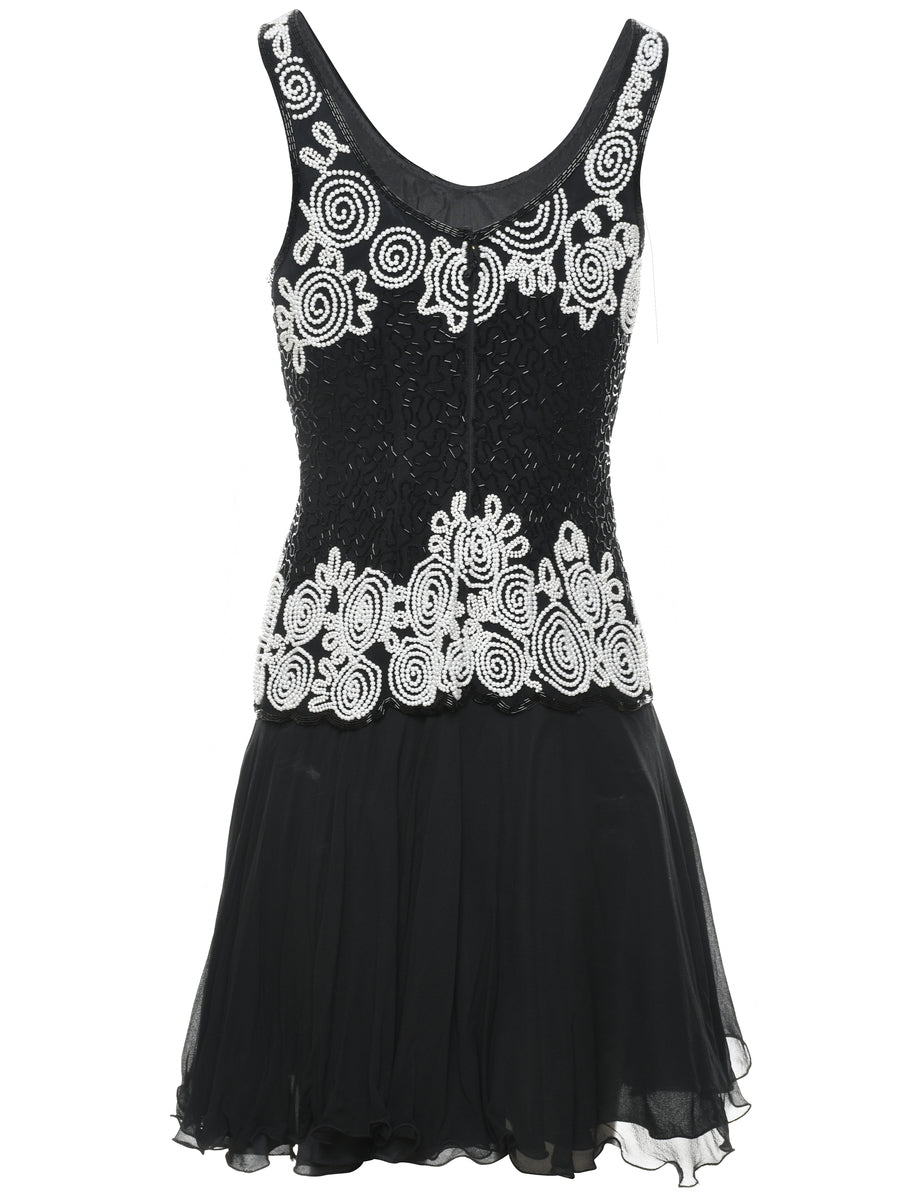 Silk Beaded Black & Silver Drop Waist Party Dress - M