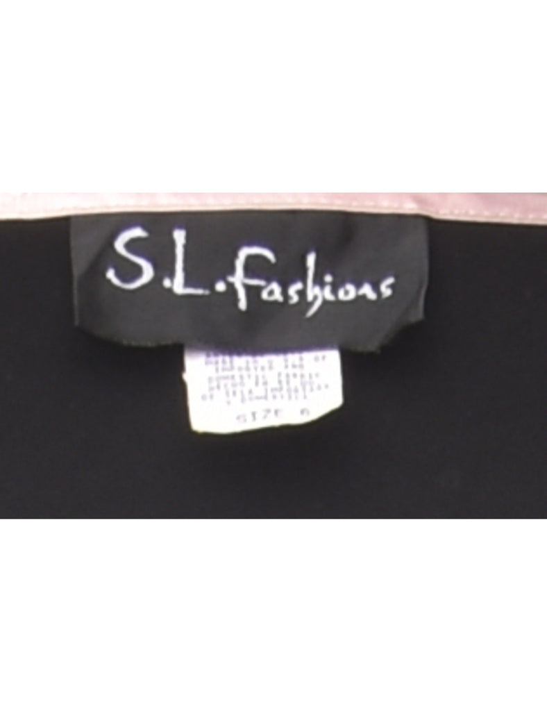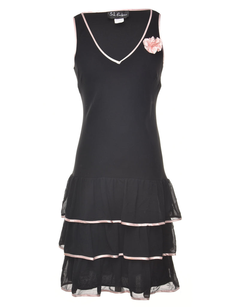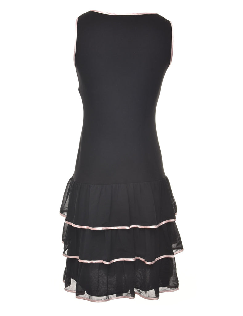Sleeveless dress. Comes in black with a ra-ra skirt and decorative trim.