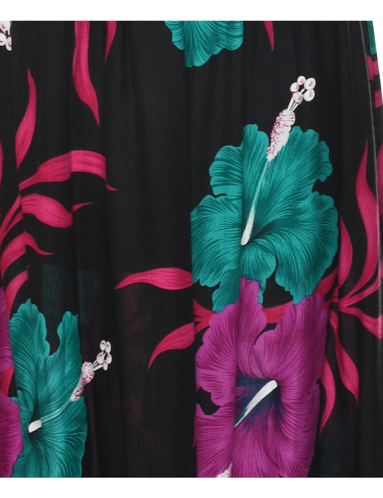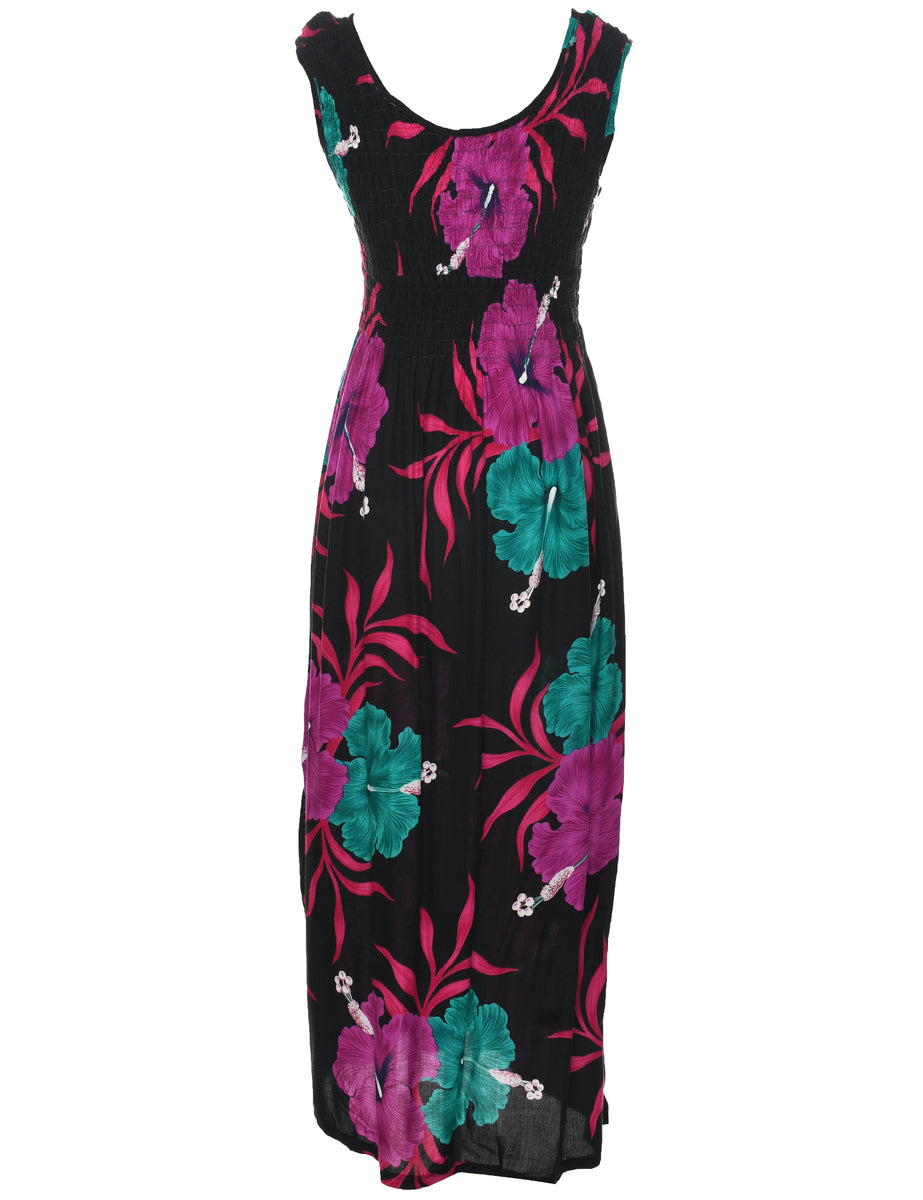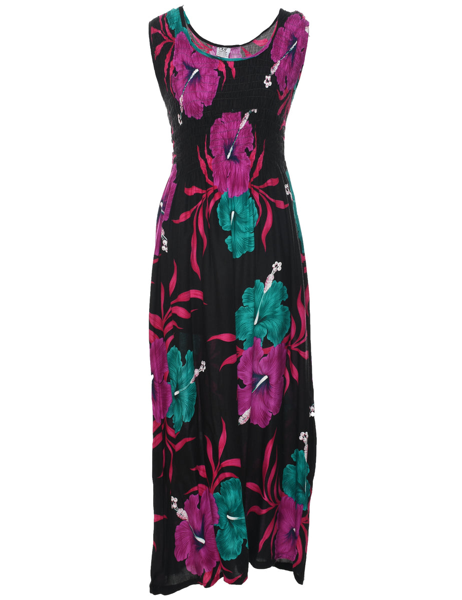 Smocked sleeveless dress with floral pattern comes in black with a round neck.