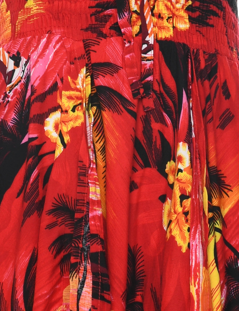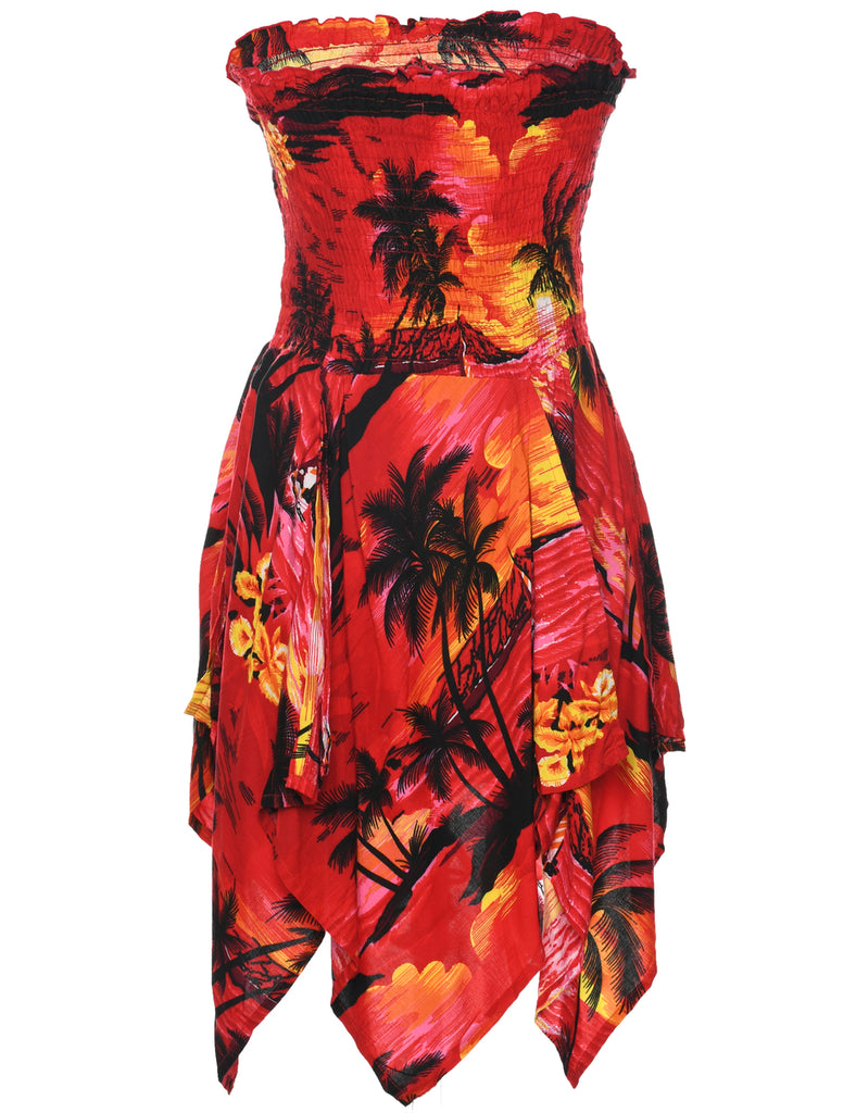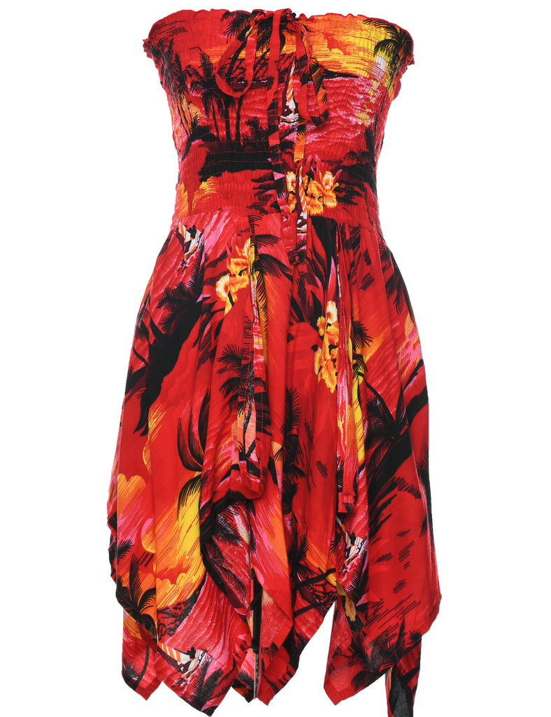 Smocked strapless dress in red with floral pattern, an asymmetric hem.