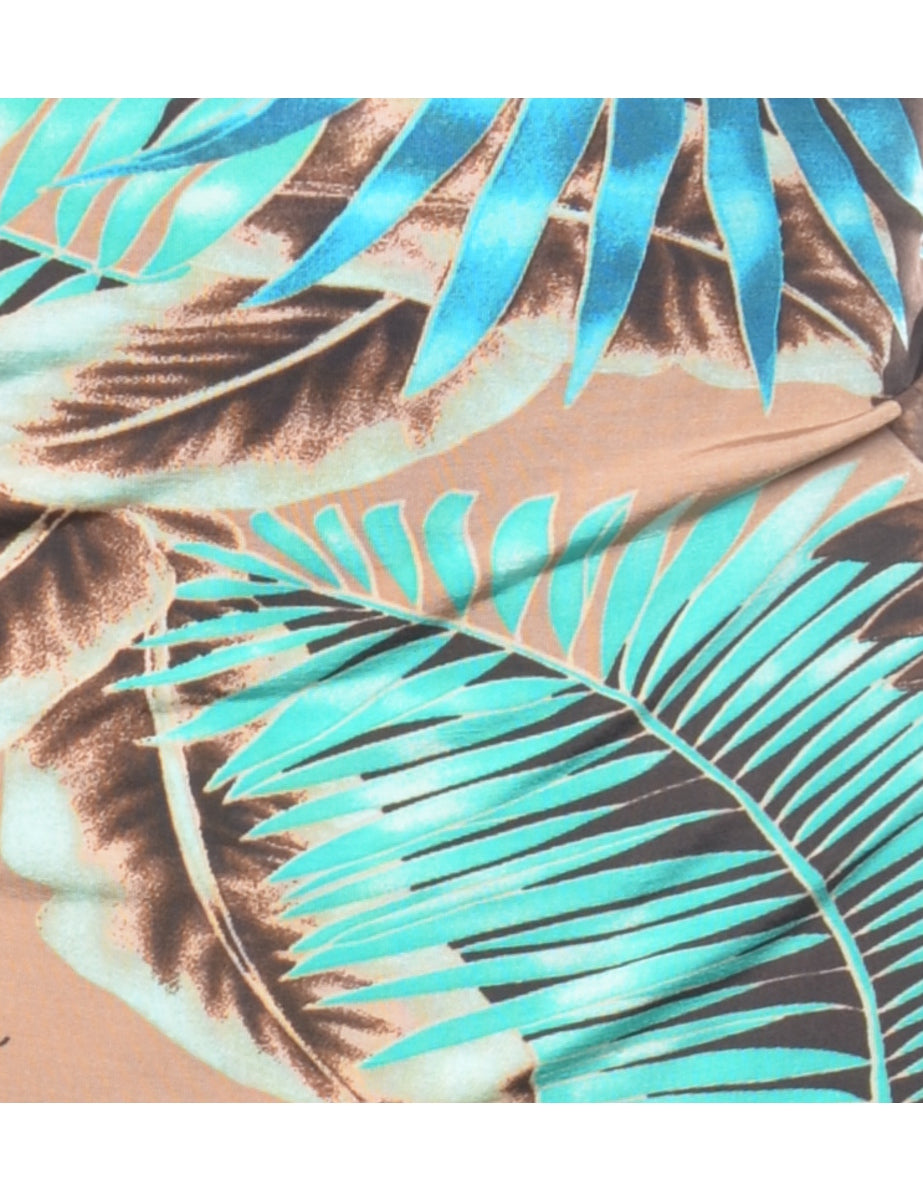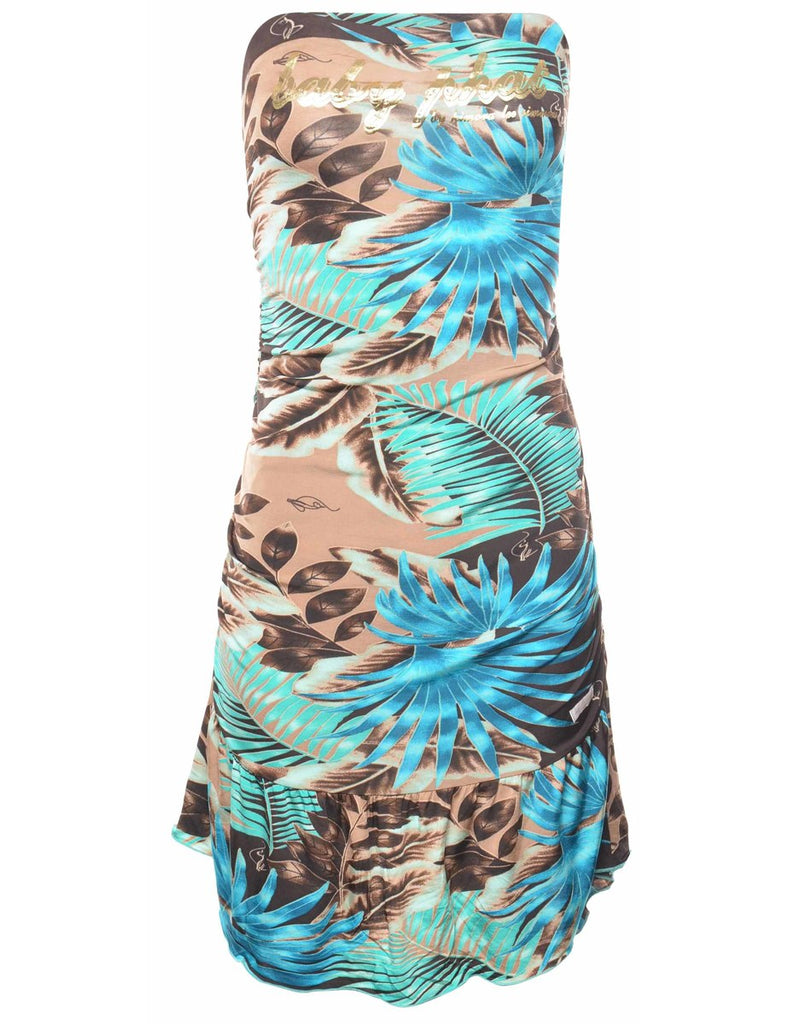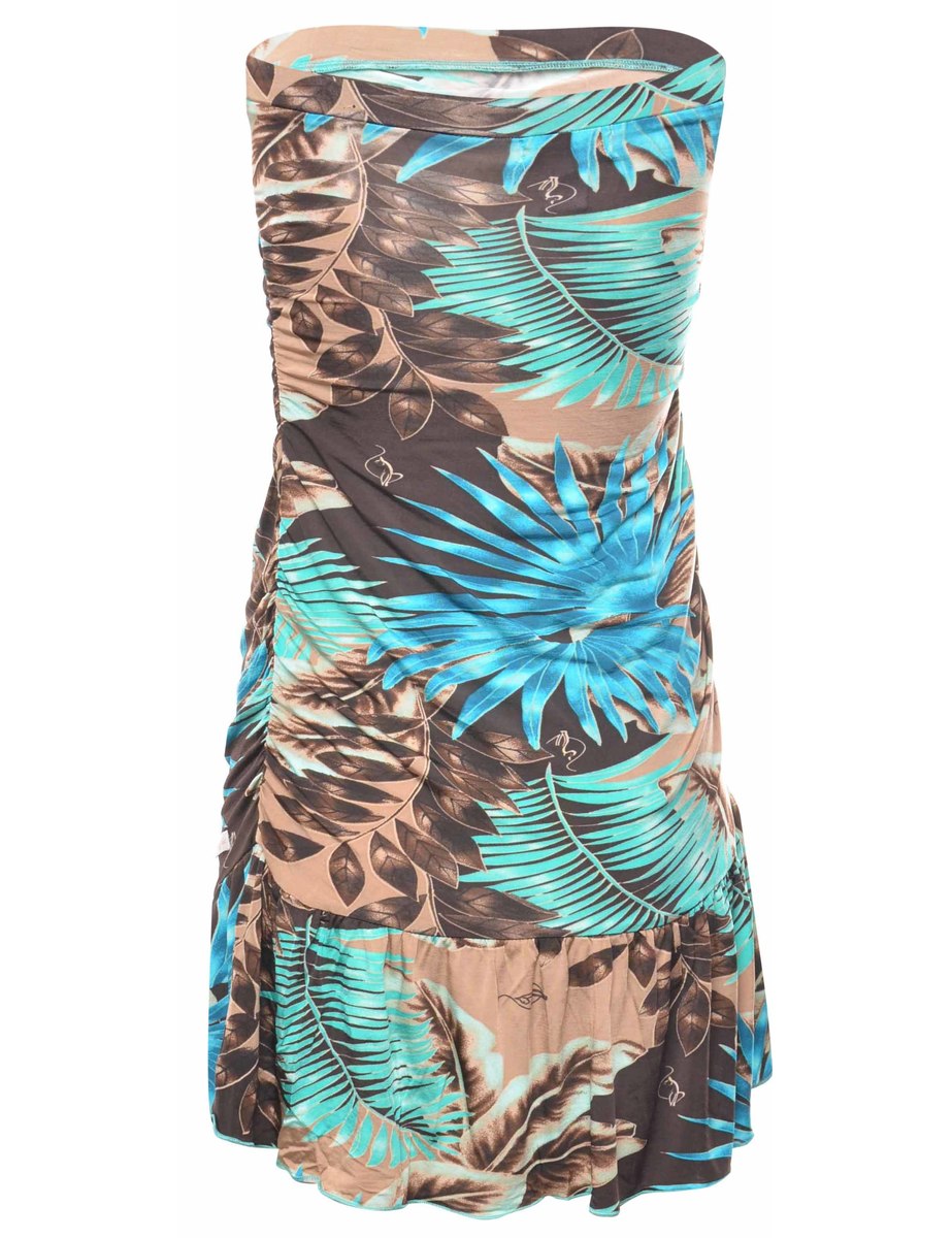 Strapless multi-colour dress with foliage print, ruched detailing.
