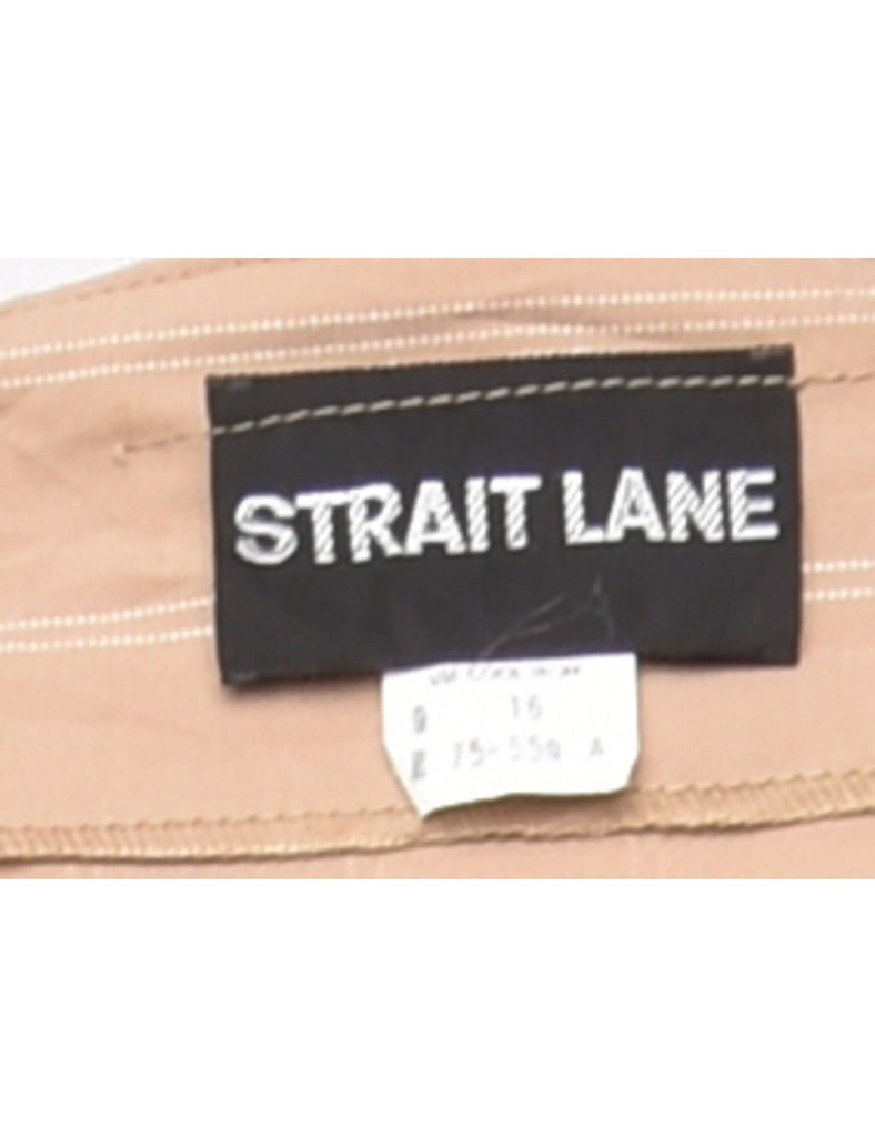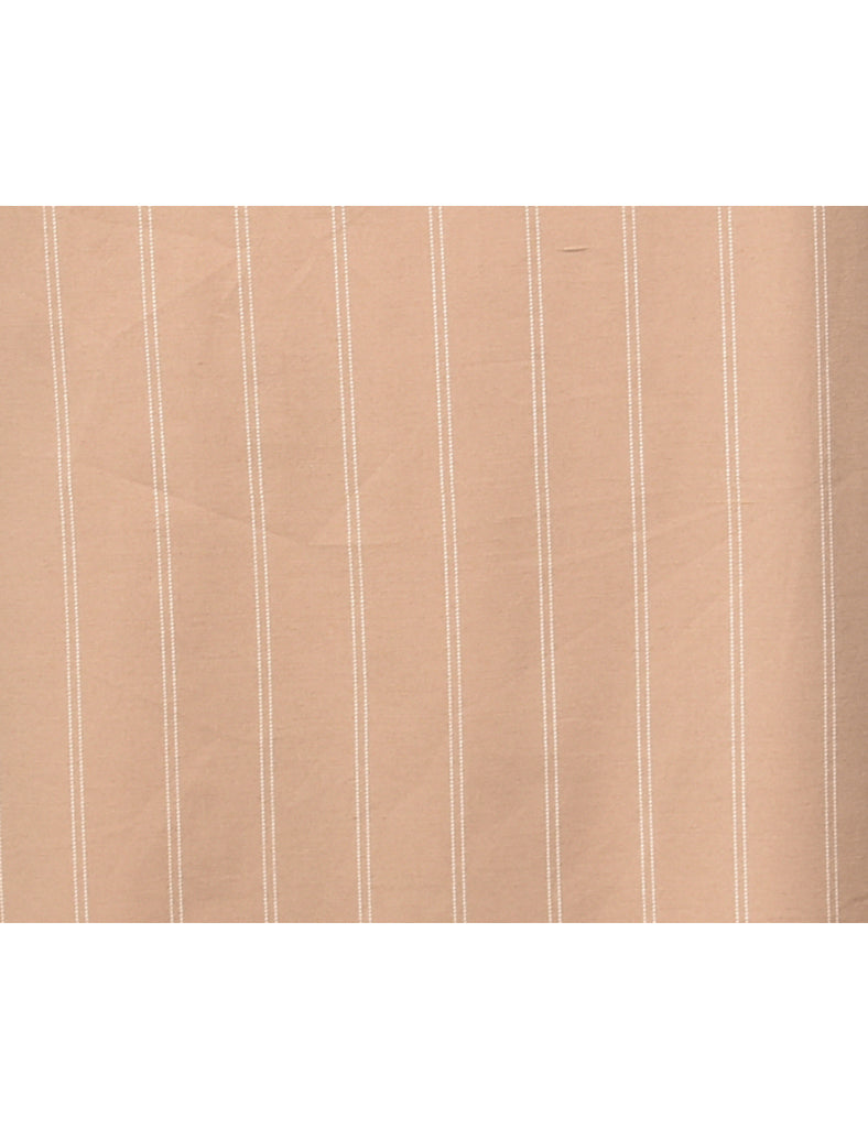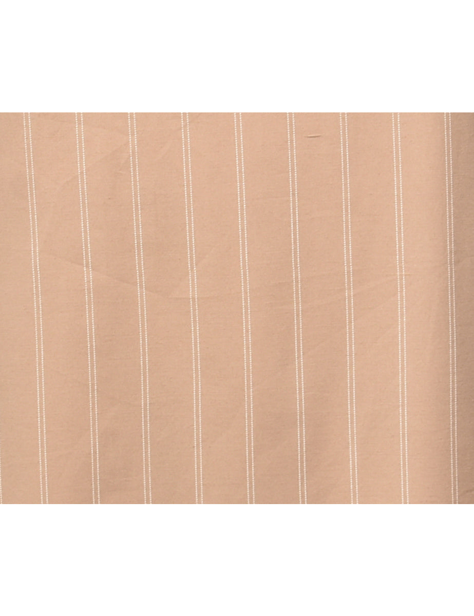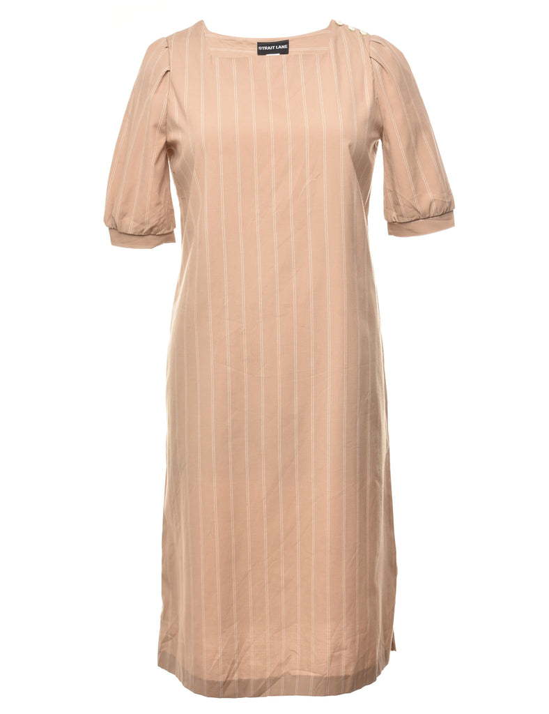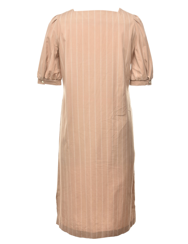 Striped shift dress in brown with buttons on the shoulder and a square neck.