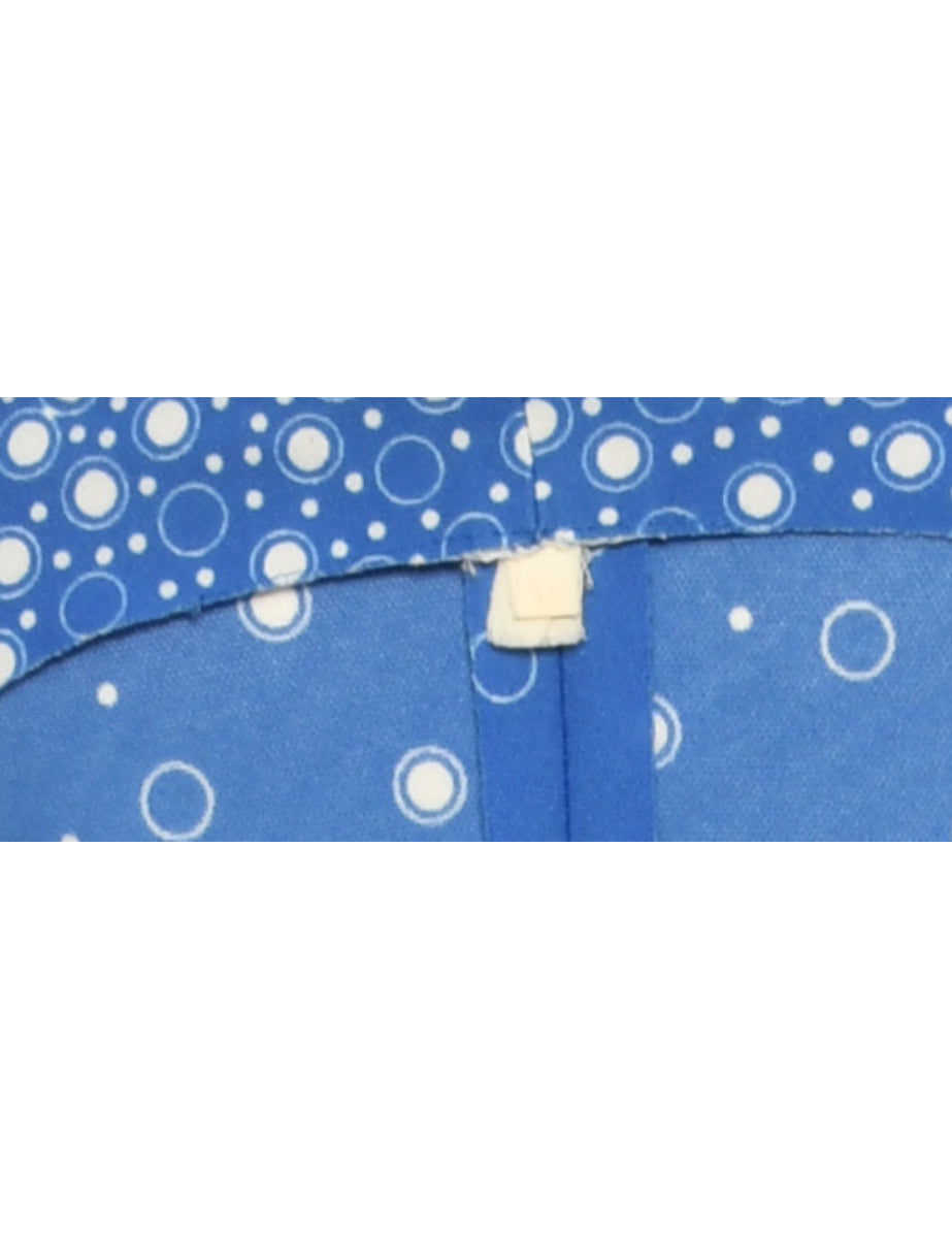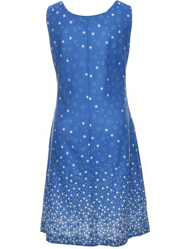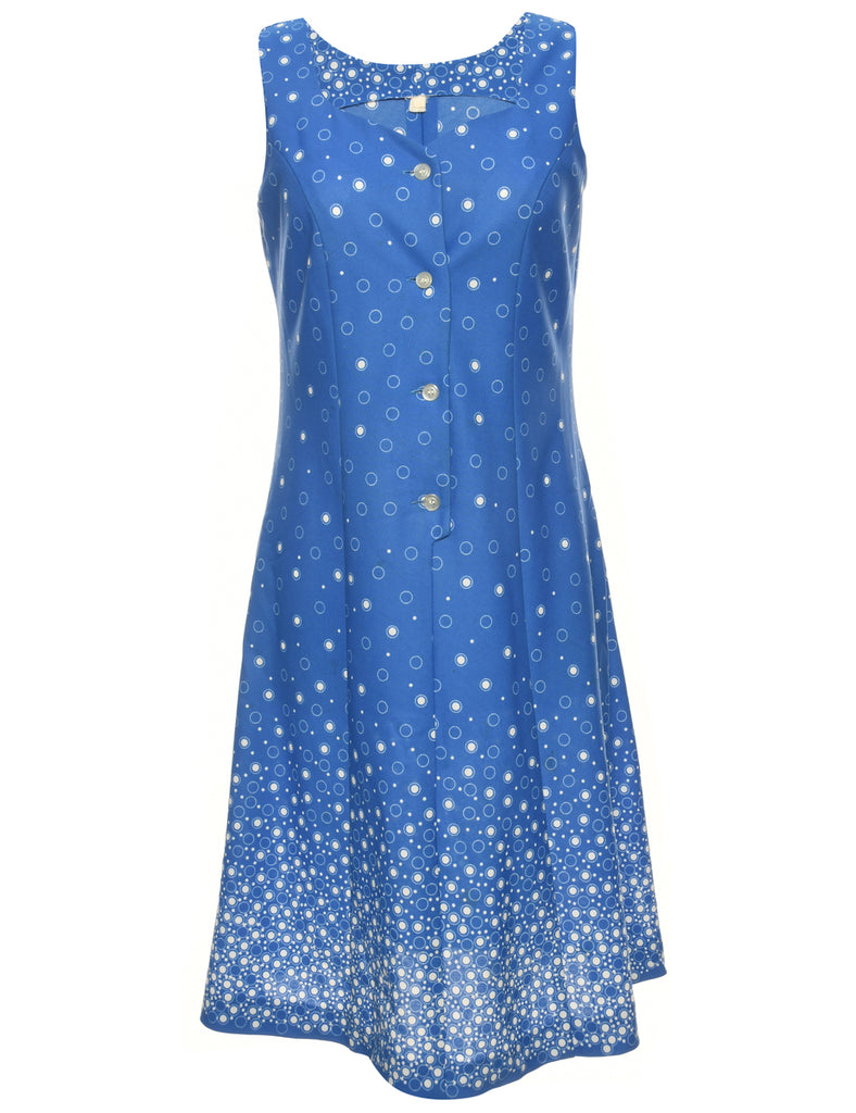 Sleeveless blue and white polka dot print day dress. Complete with sweetheart neckline and button up front.
