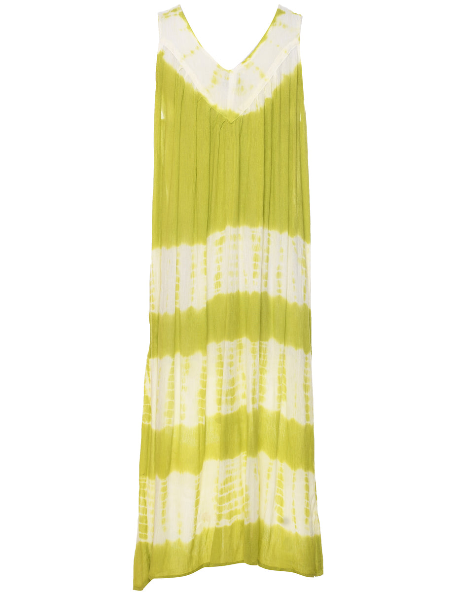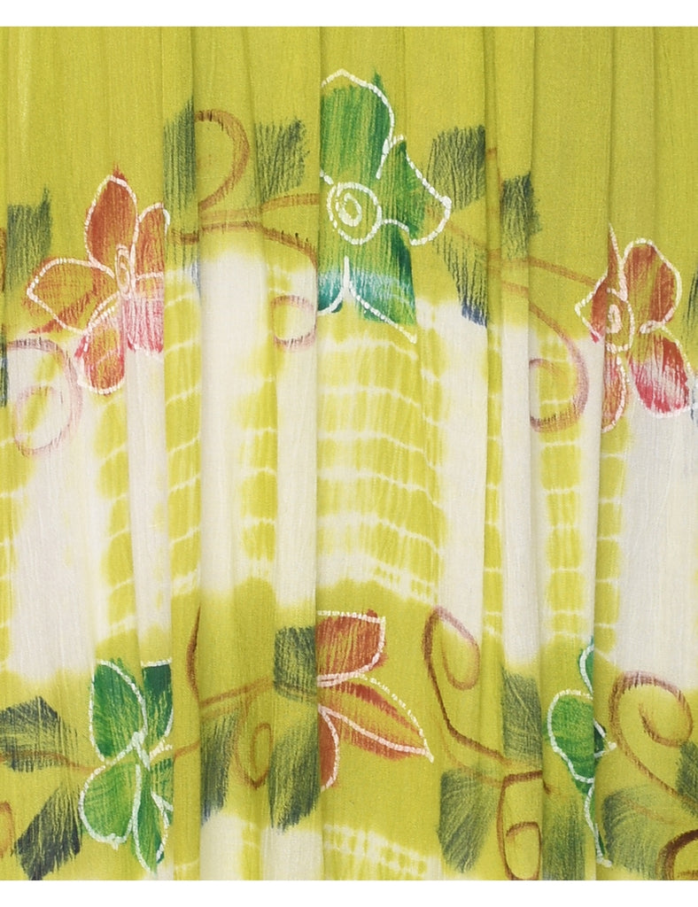 Tie dyed dress in white & light green with floral pattern, ruched detailing and v neck.