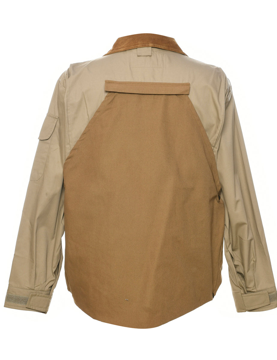 Workwear beige jacket with an applique design and multiple pockets.