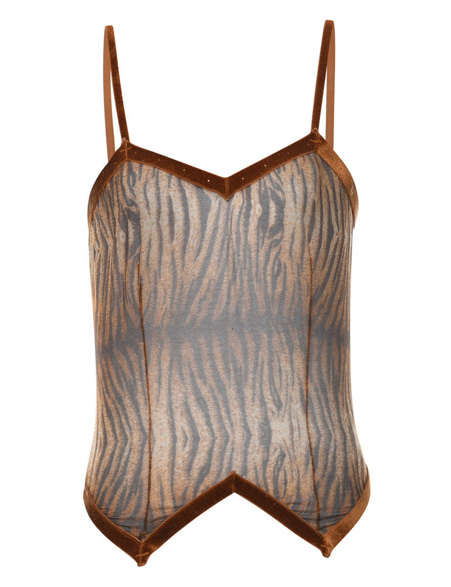 Black & brown animal print sheer camisole complete with velvet trim.