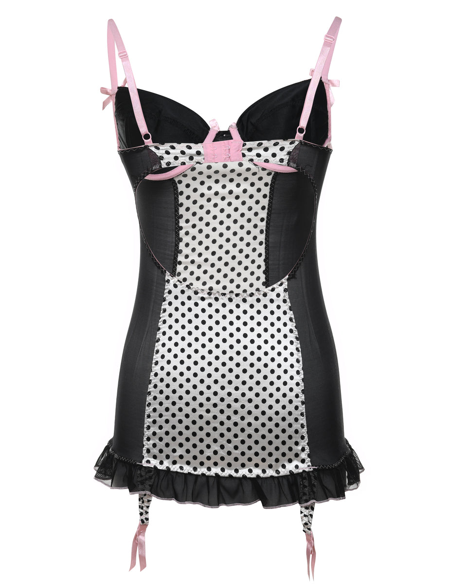 Black & white polka dot print babydoll complete adjustable straps, pink trim and a built-in-bra.
