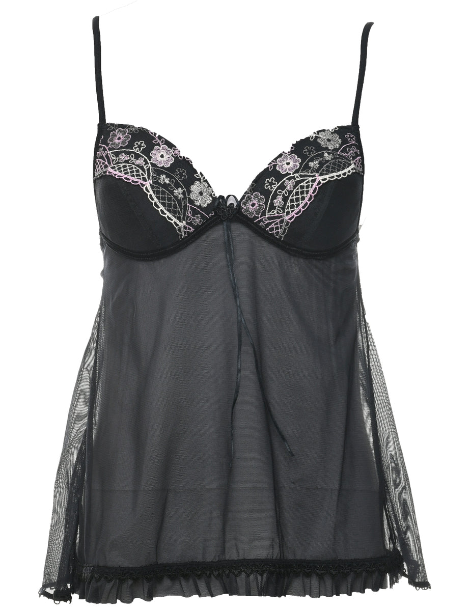 Bold babydoll comes in black with adjustable straps and lace trim.