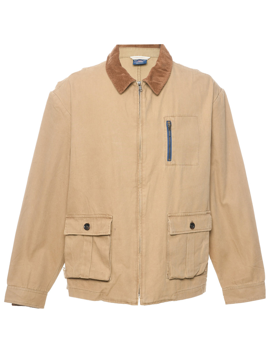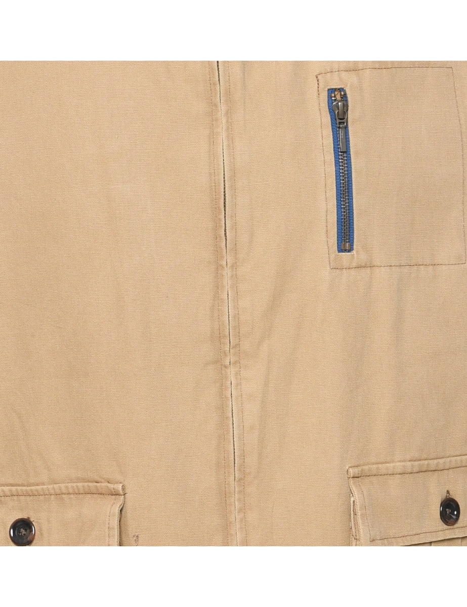 Zip front beige jacket with contrasting collar and multiple pockets.