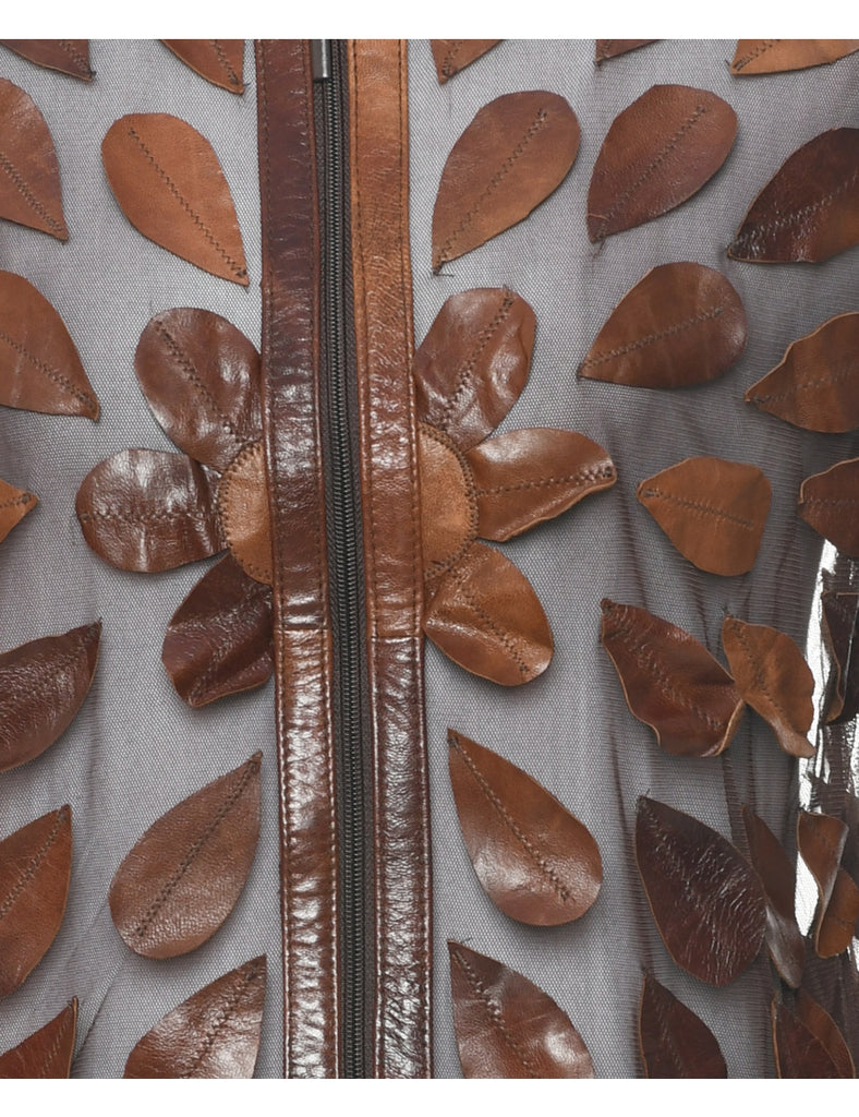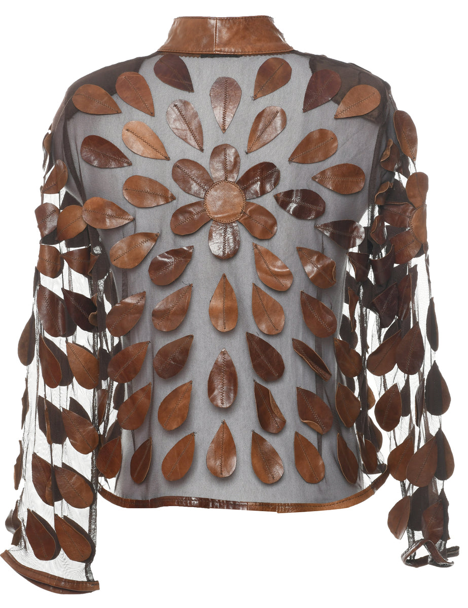 Zip front jacket with sheer effect. Comes in brown.
