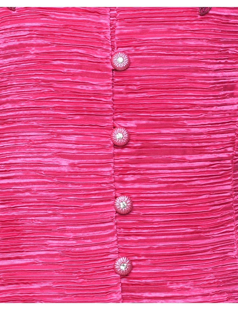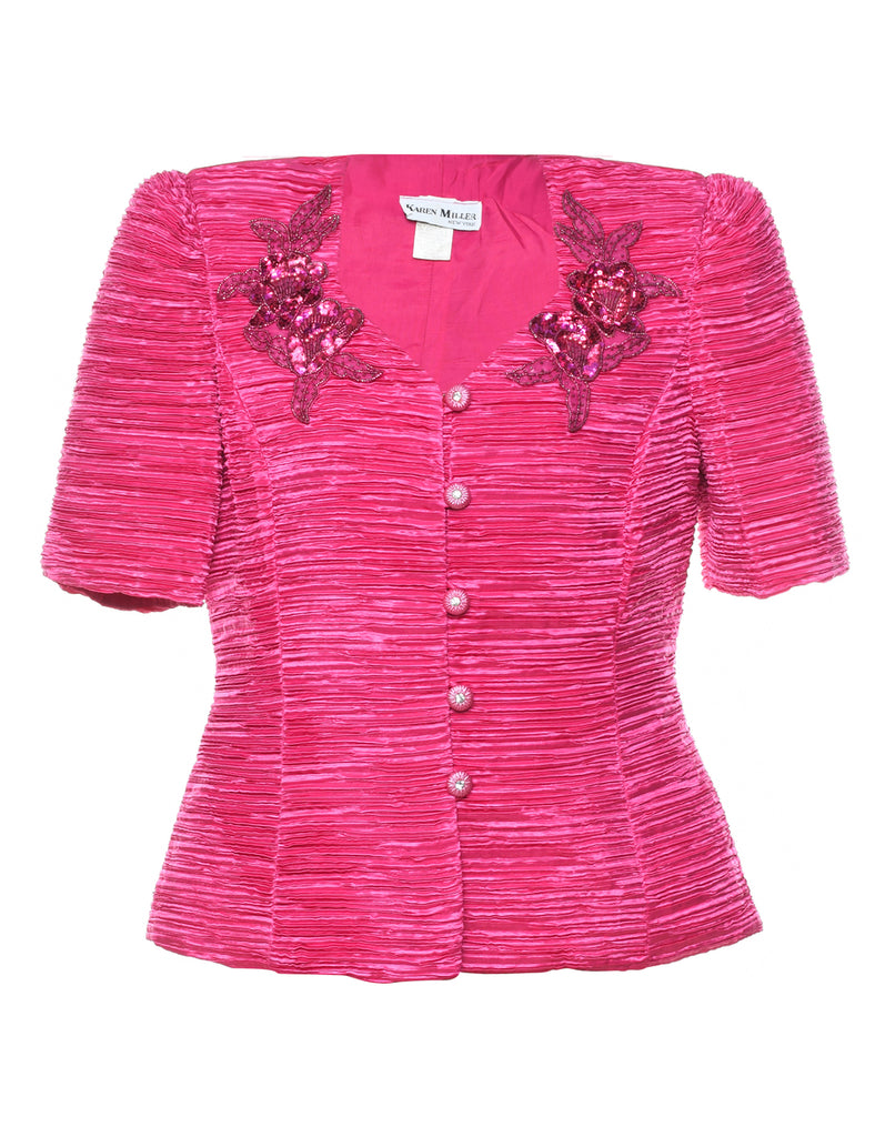 Button-front pink sequined evening jacket complete with beading and removable shoulder pads.