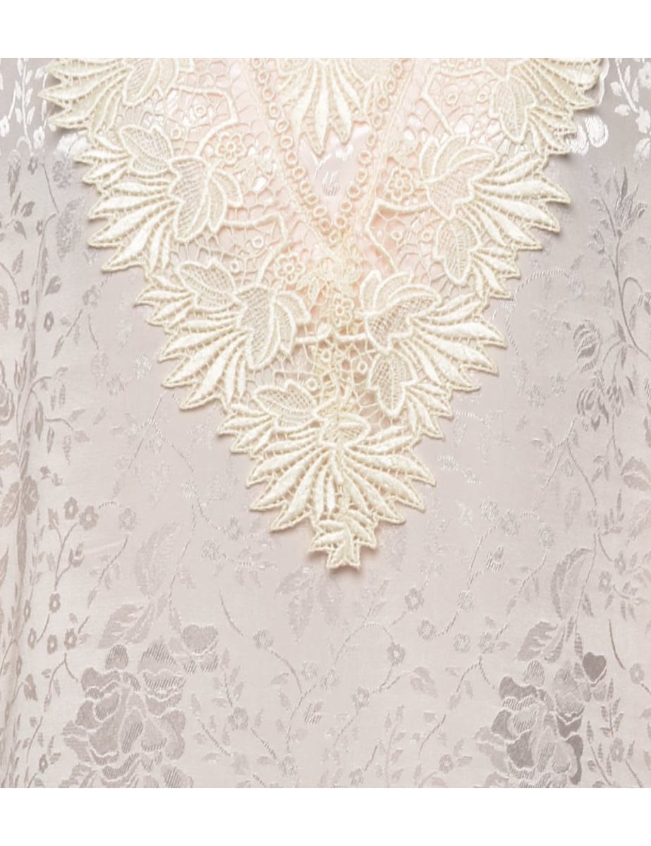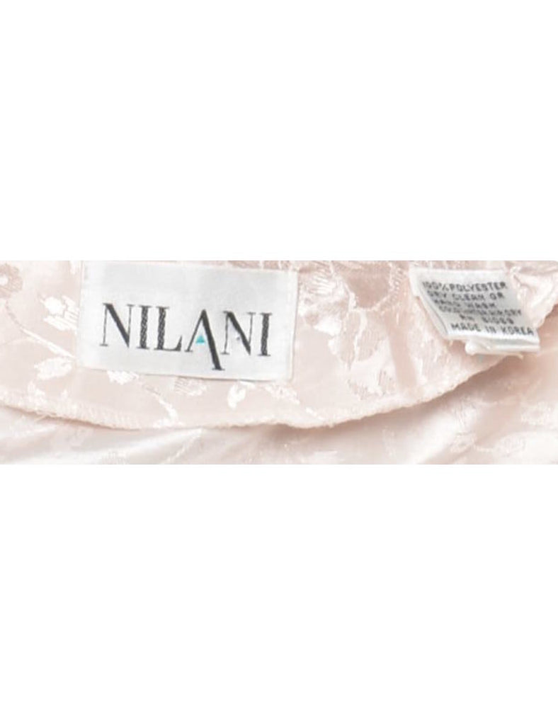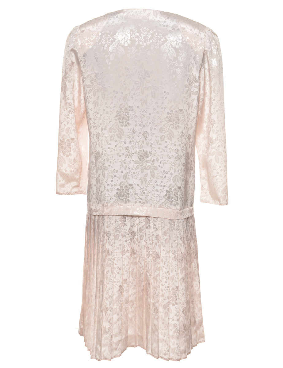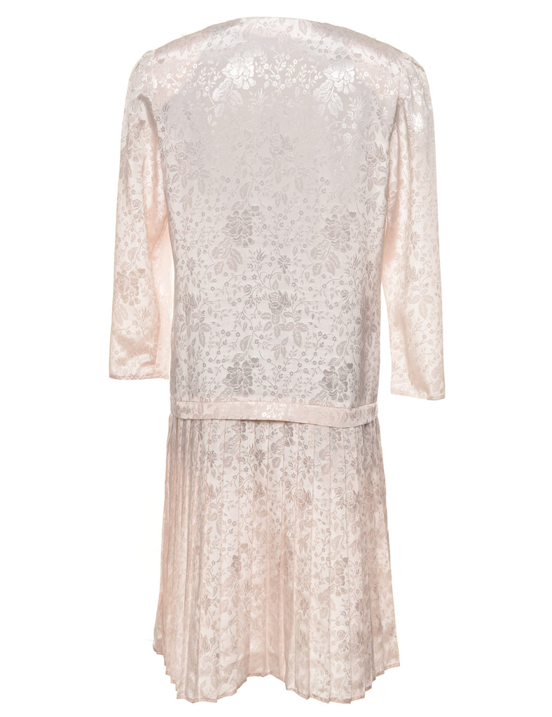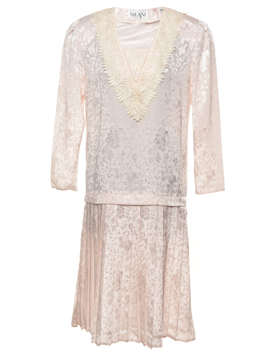 Floral print evening dress. Comes in off white with pleating and lace trim.