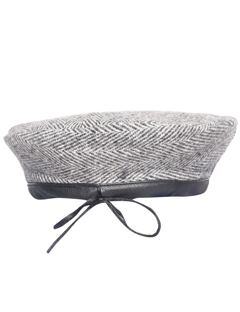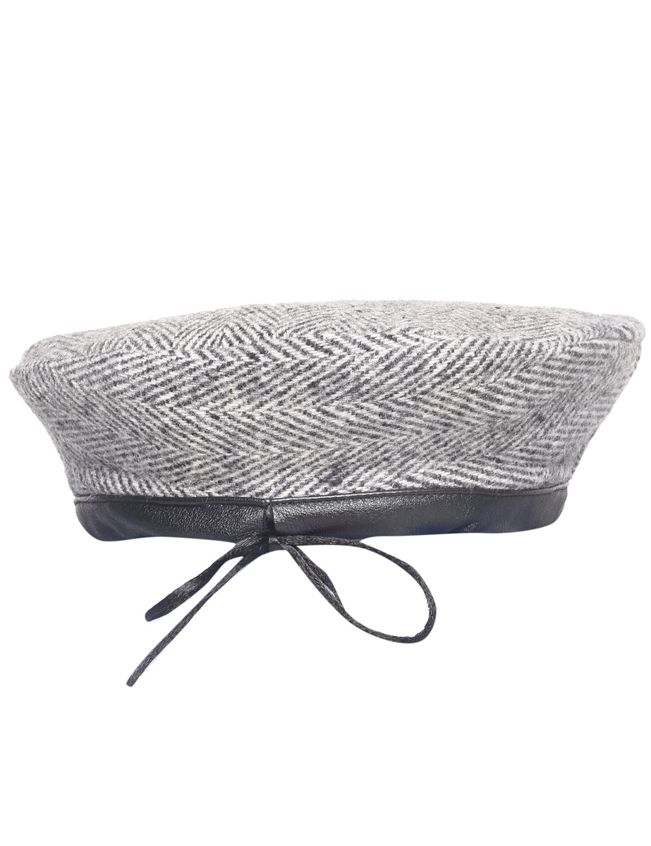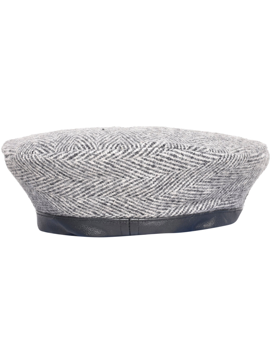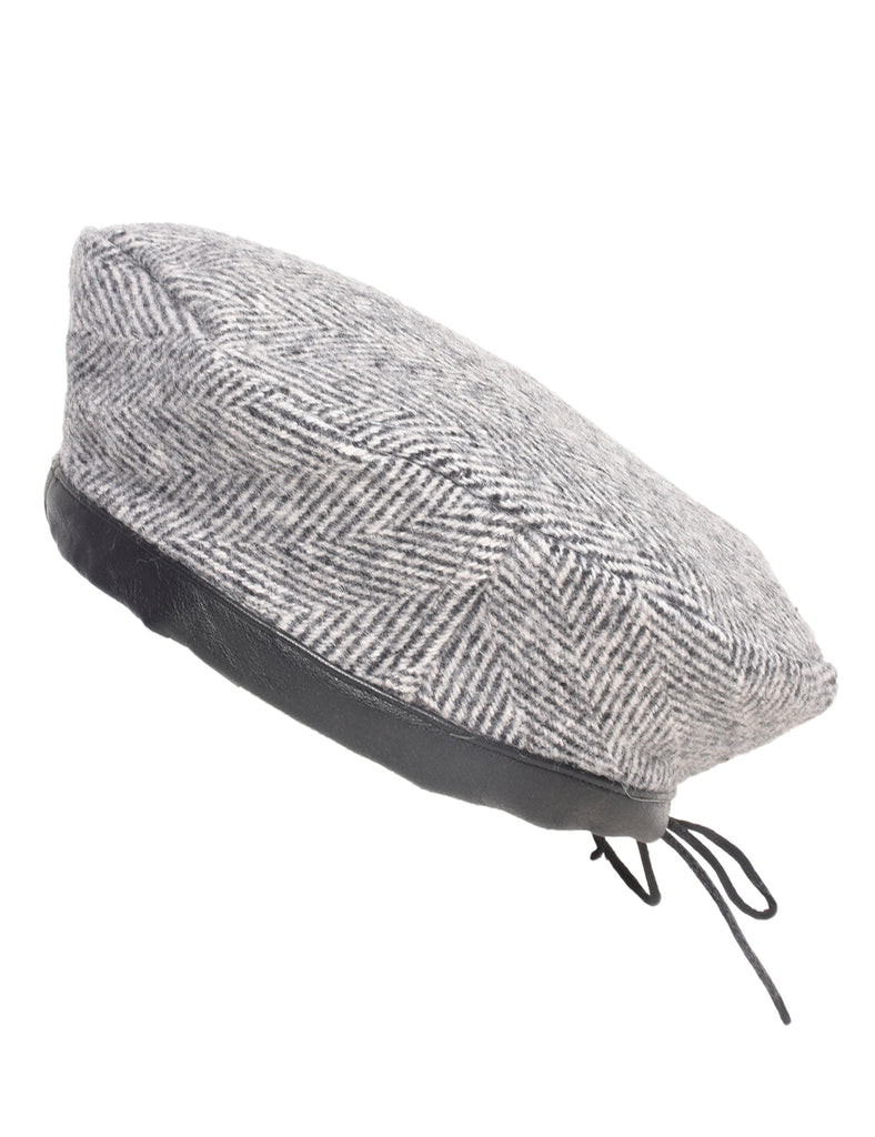 Wool beret with herringbone tweed from Beyond Retro Label. Comes in grey with leather trim.