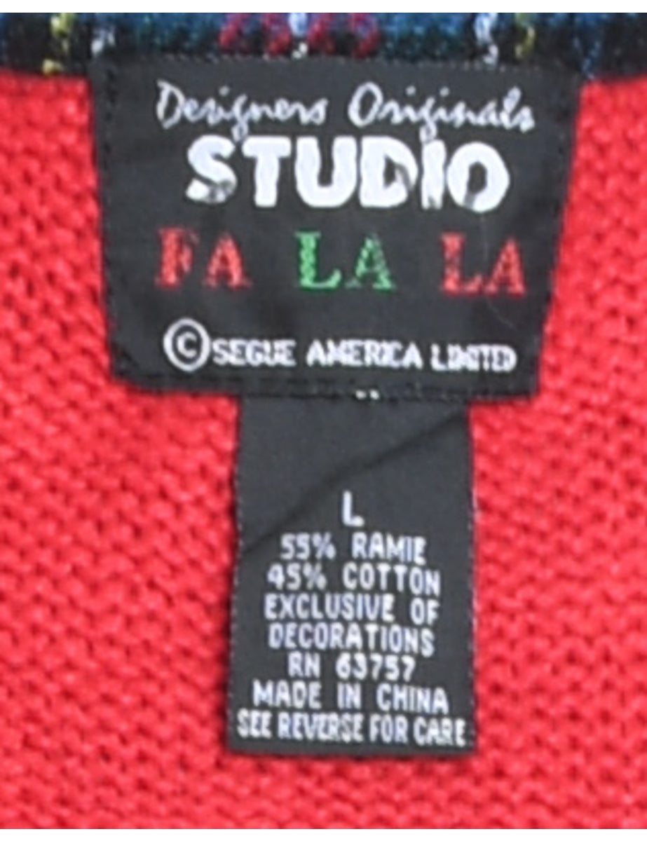 Festive print christmas jumper comes in red with lurex thread pattern and an applique design.