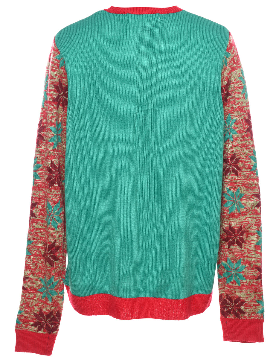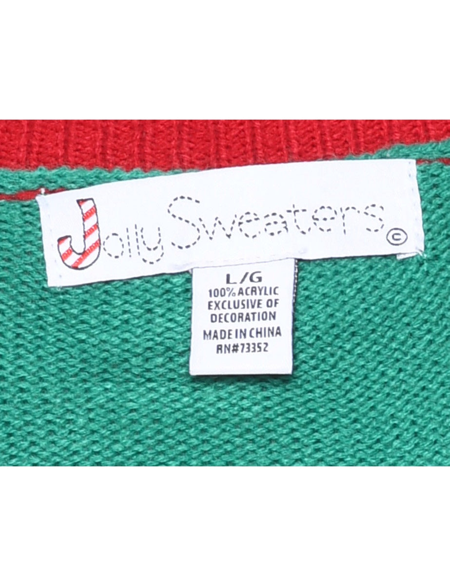 Reindeer christmas jumper in green with embroidery and pom poms.
