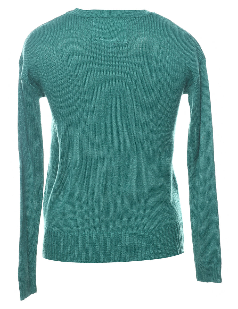 Reindeer christmas jumper in green & with pom poms and small bells attached.