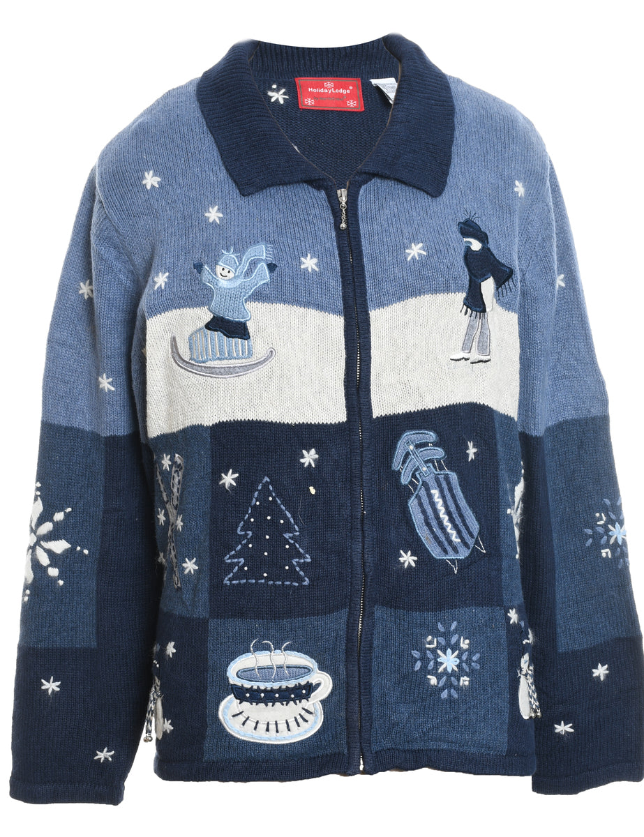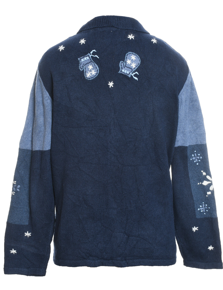 Snowman christmas cardigan in navy with an applique design and small bells attached.