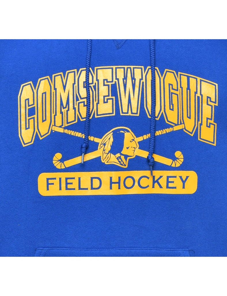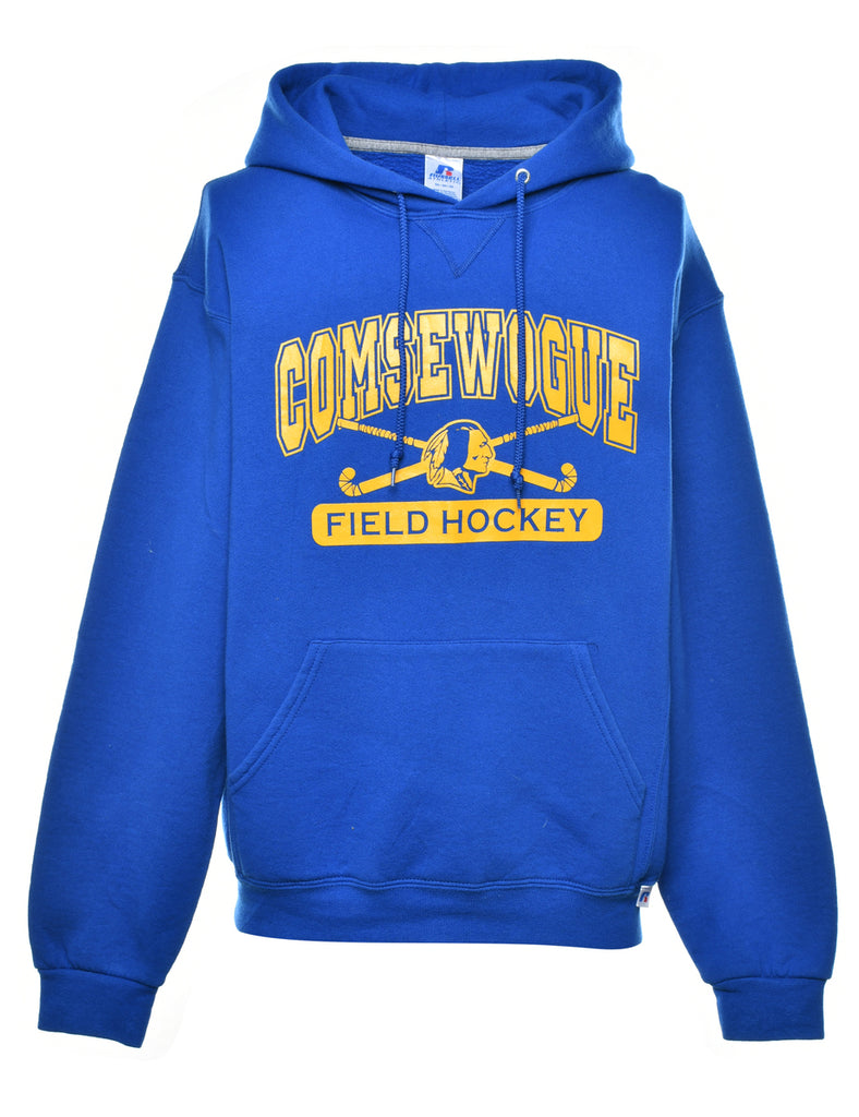 Field Hockey printed hoodie. Comes in blue with one pocket.