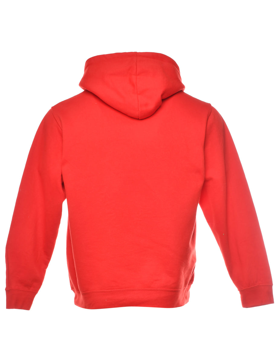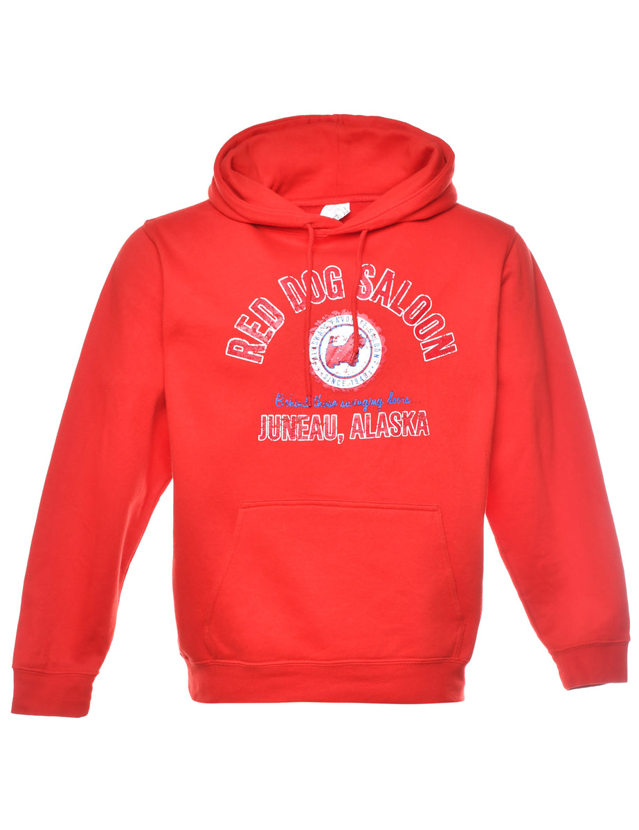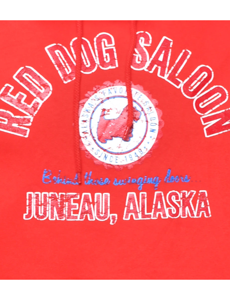 Red dog saloon printed hoodie comes in red with a drawstring neck and one pocket.