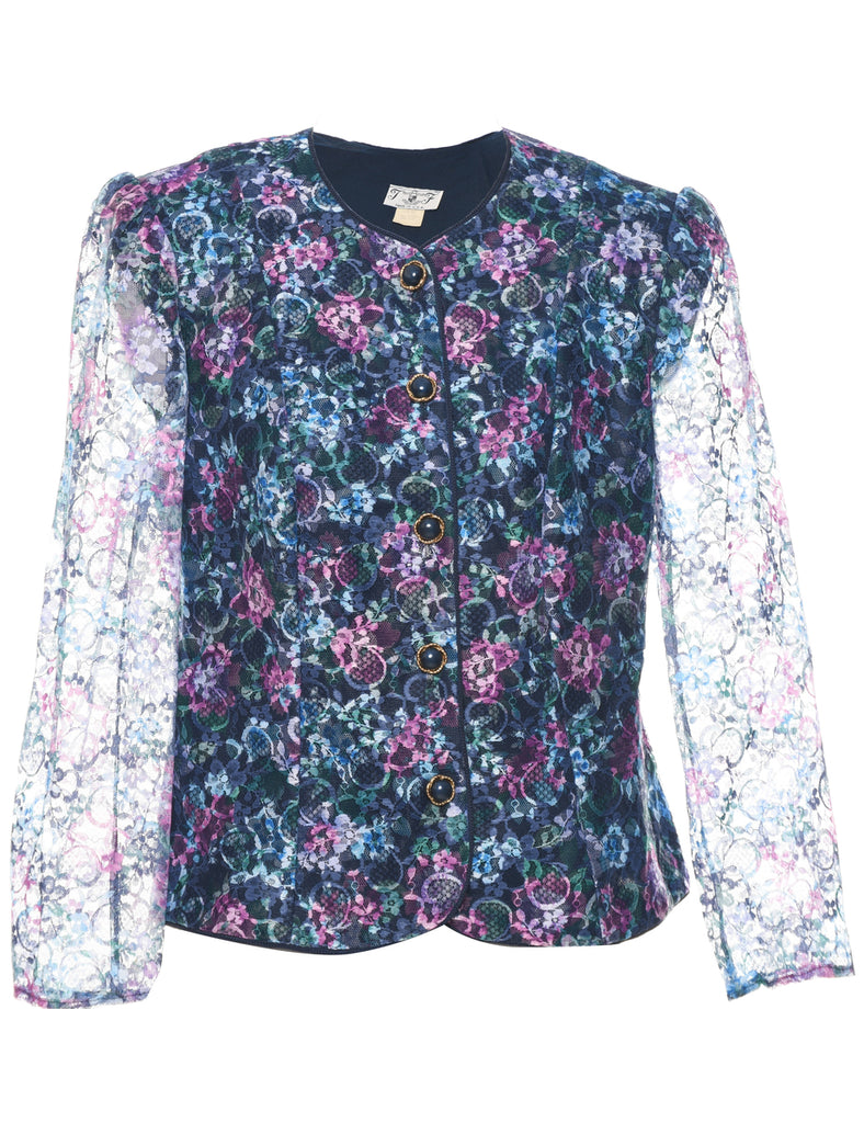 Floral pattern multi-colour jacket with shoulder pads and sheer sleeves.