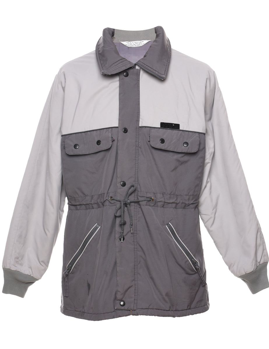 Grey & beige two-tone nylon jacket complete with full lining and multiple pockets.