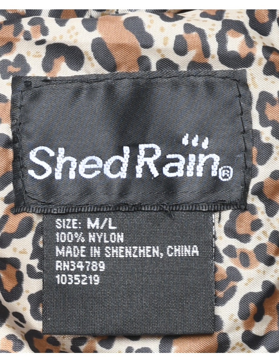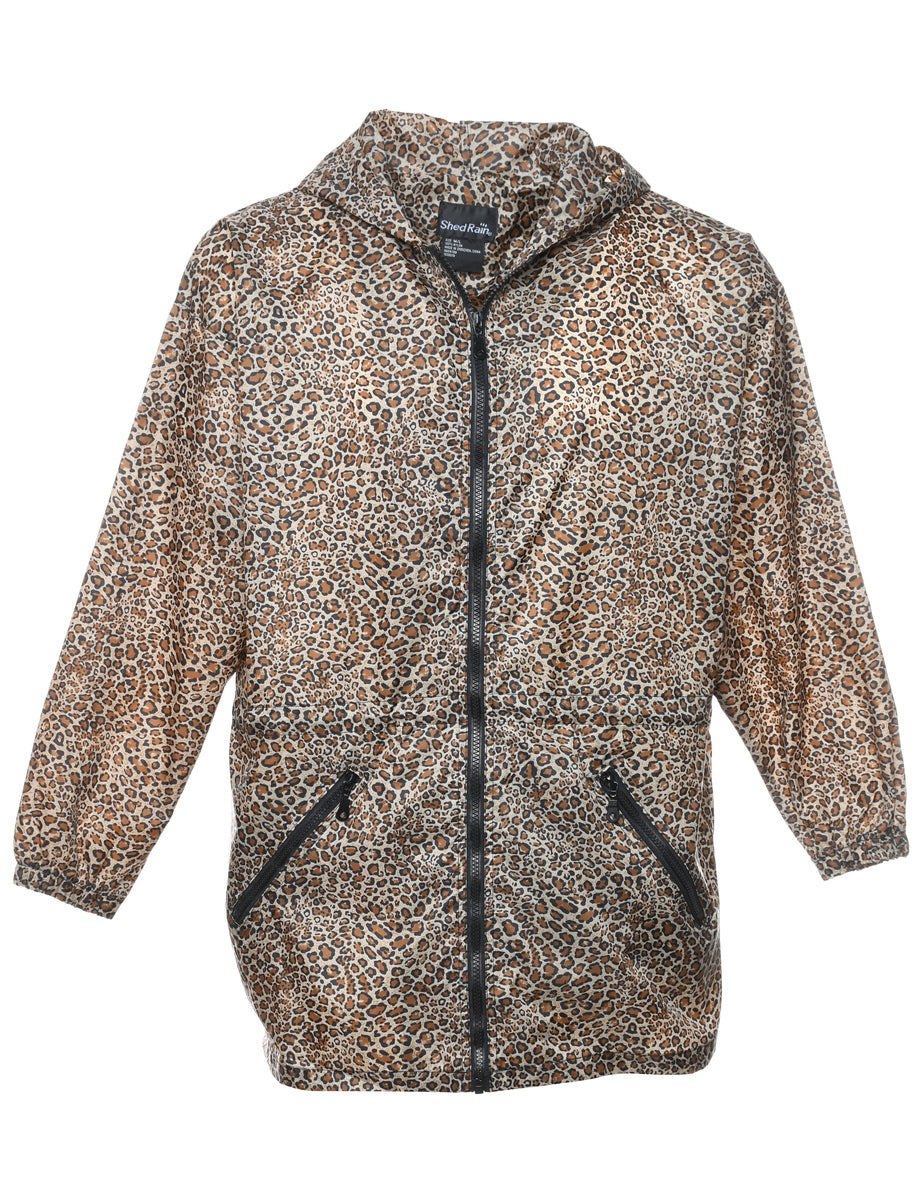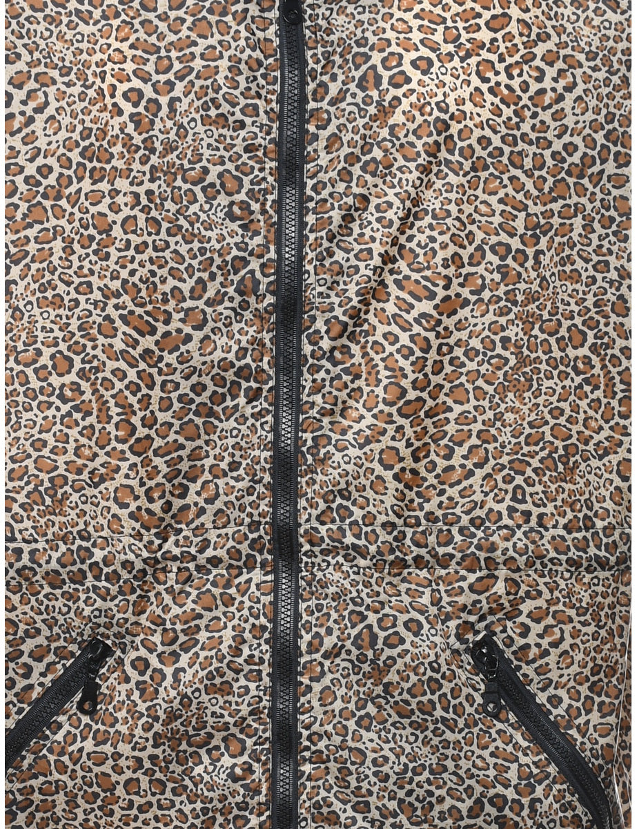 Hooded leopard print black & brown nylon jacket complete with multiple pockets.