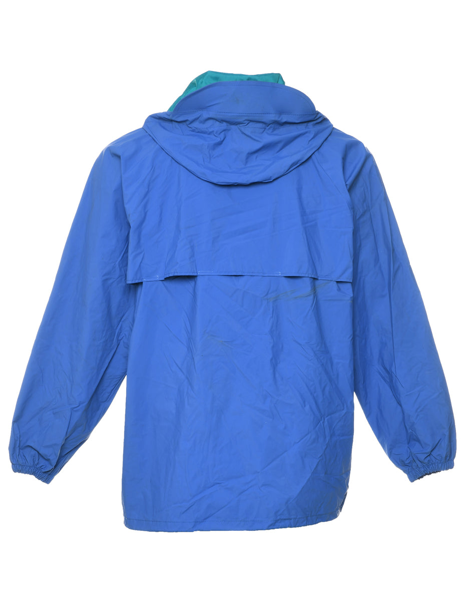 Zip front raincoat. Comes in blue with a hood and multiple pockets.