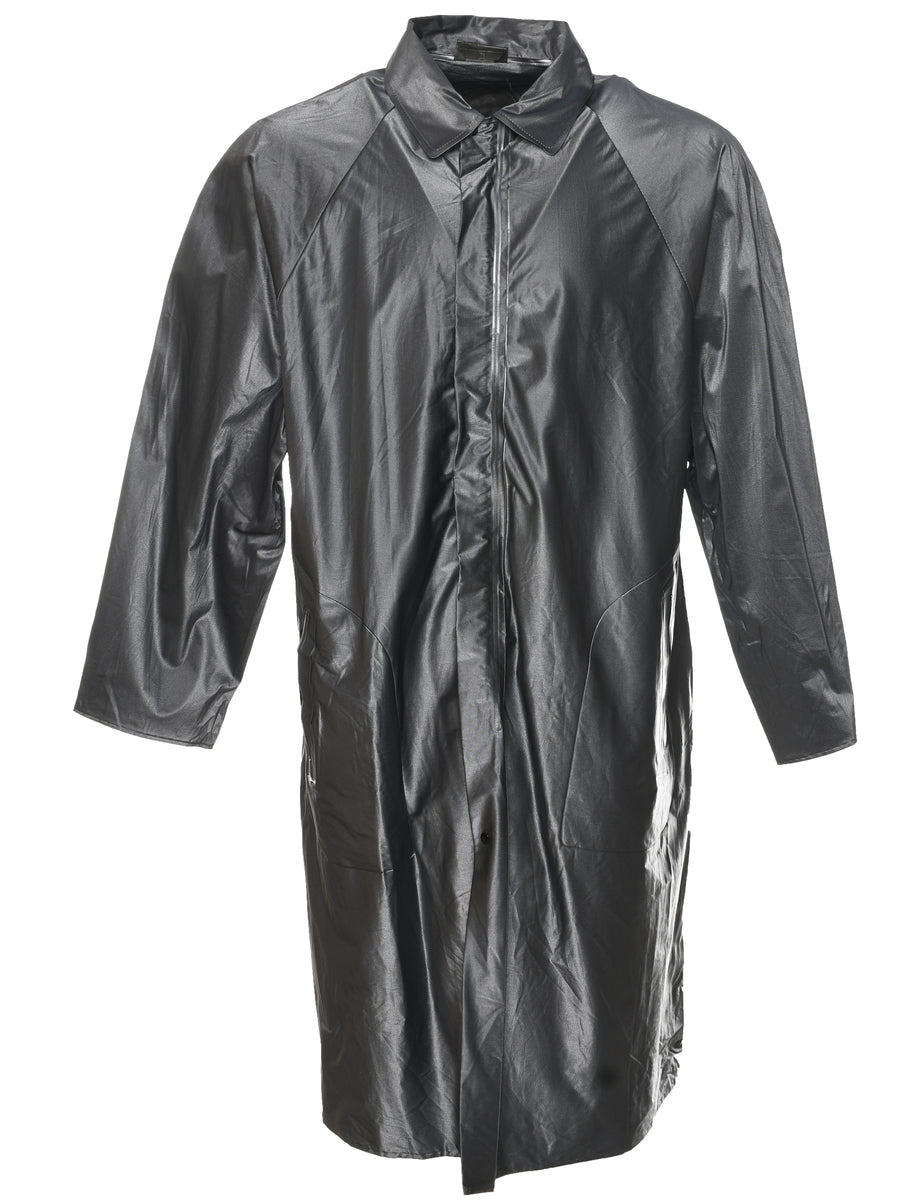 Zip front raincoat comes in dark grey with multiple pockets and raglan sleeves.