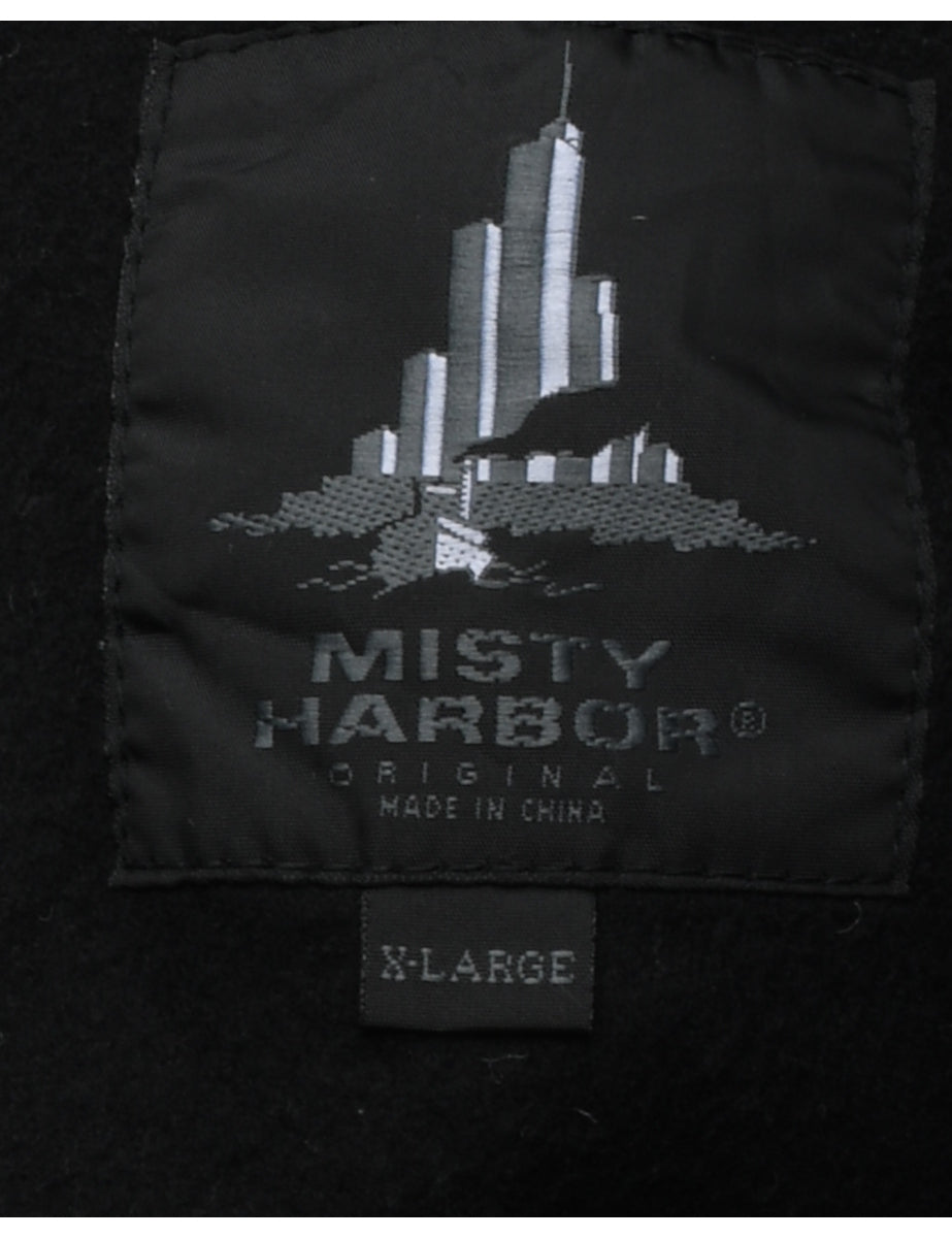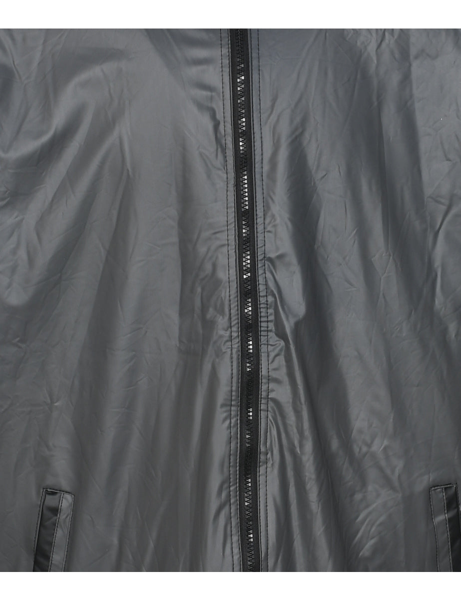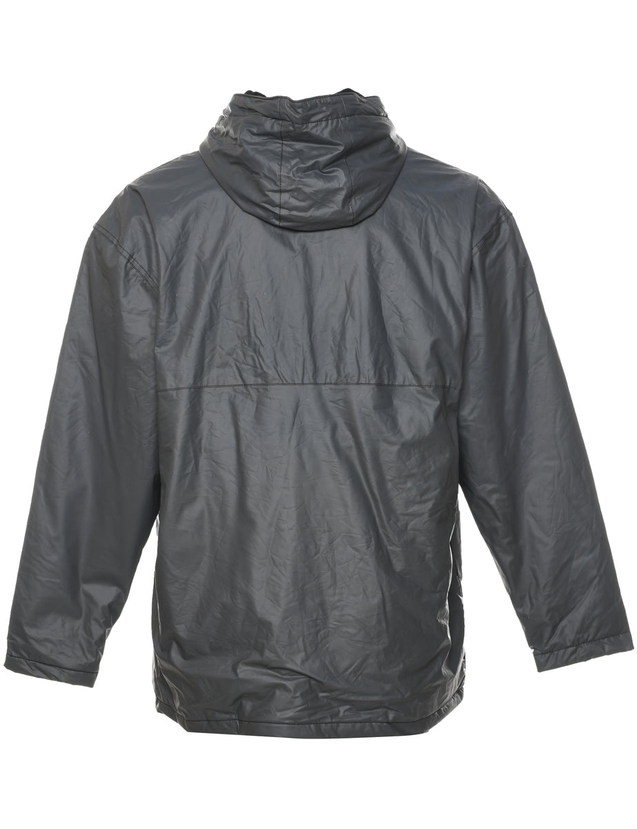 Zip front raincoat in dark grey with a hood and multiple pockets. From the brand Misty Harbor.