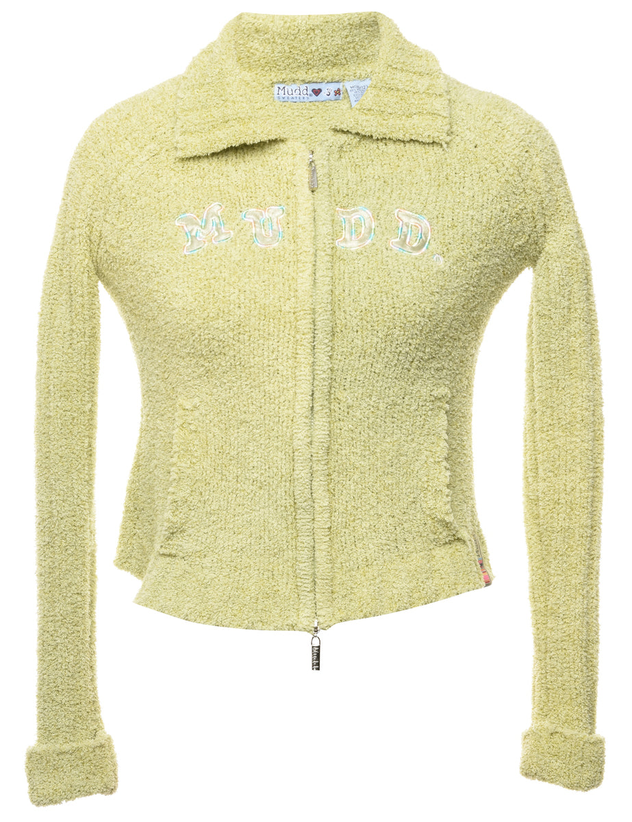 Cropped cardigan with lurex thread pattern. Comes in lime green with multiple pockets.The size label mentions M but based on the actual measurements we consider it a size S.