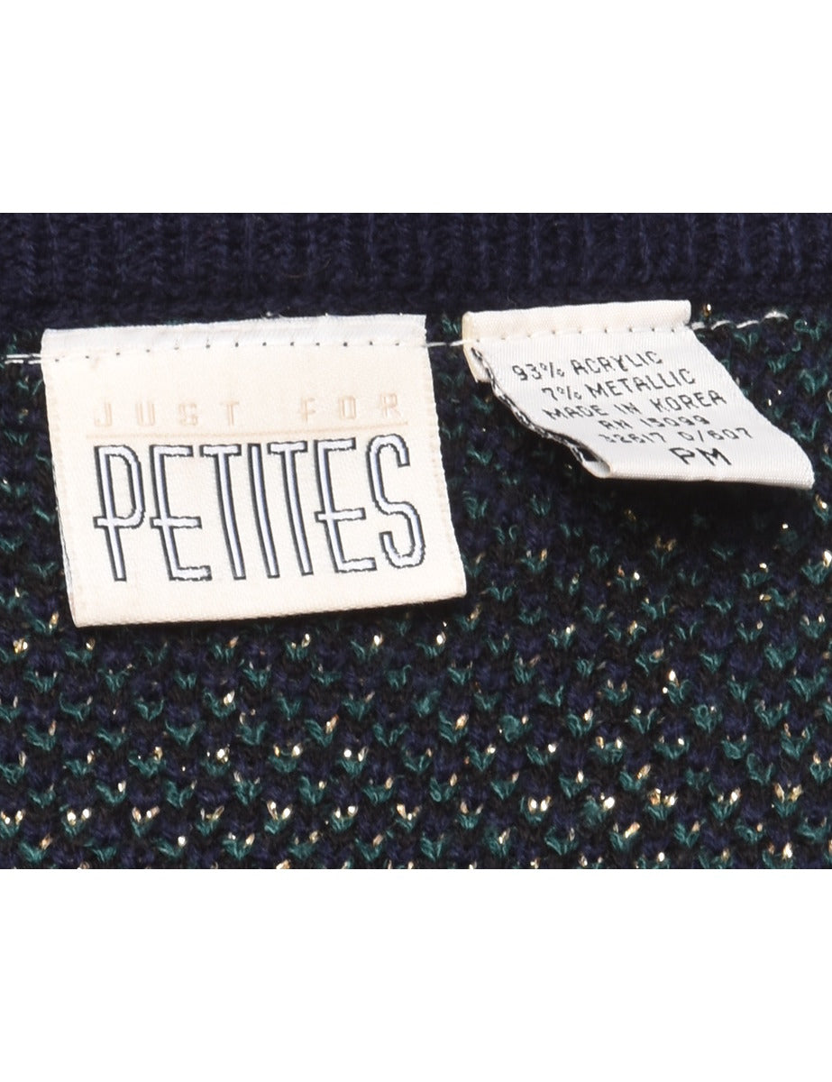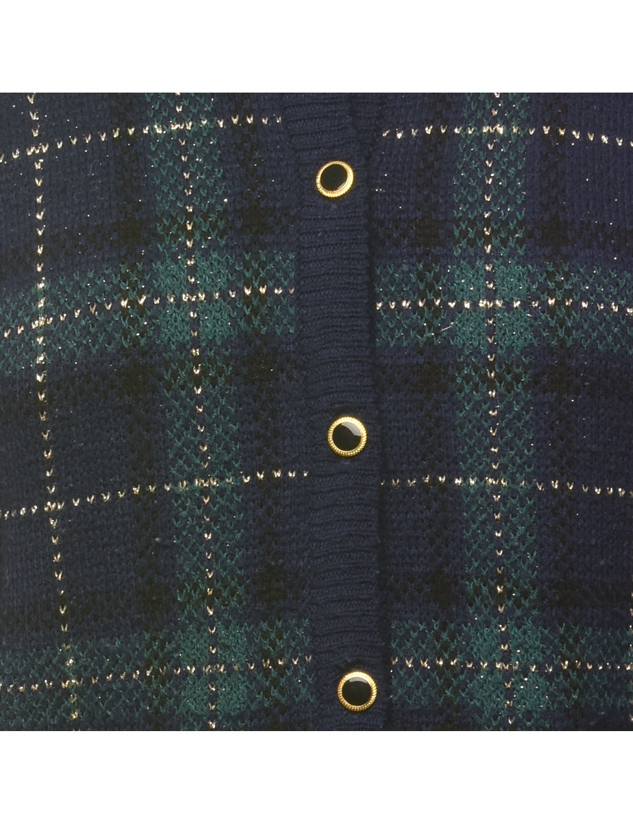 Checked cardigan with lurex thread pattern. Comes in multi-colour with decorative buttons and removable shoulder pads.The size label mentions M but based on the actual measurements we consider it a size S.