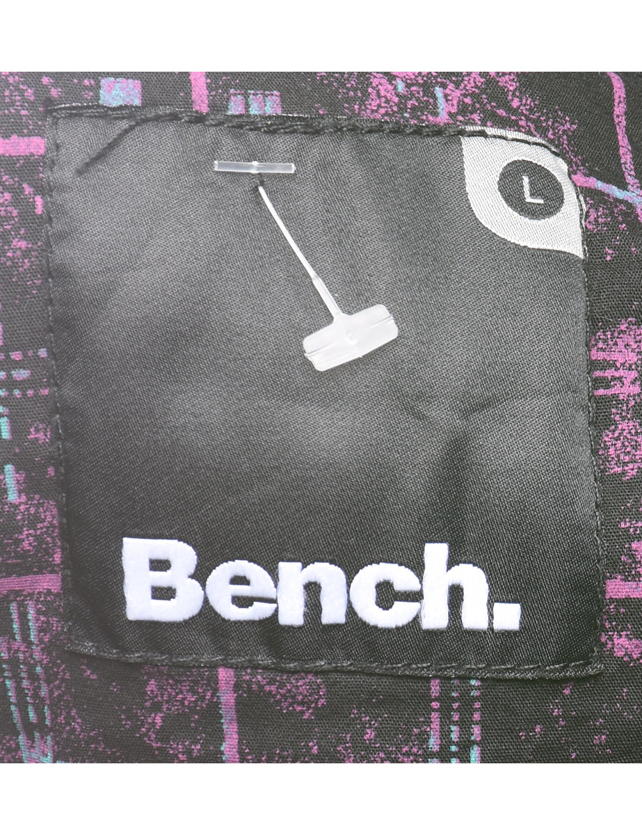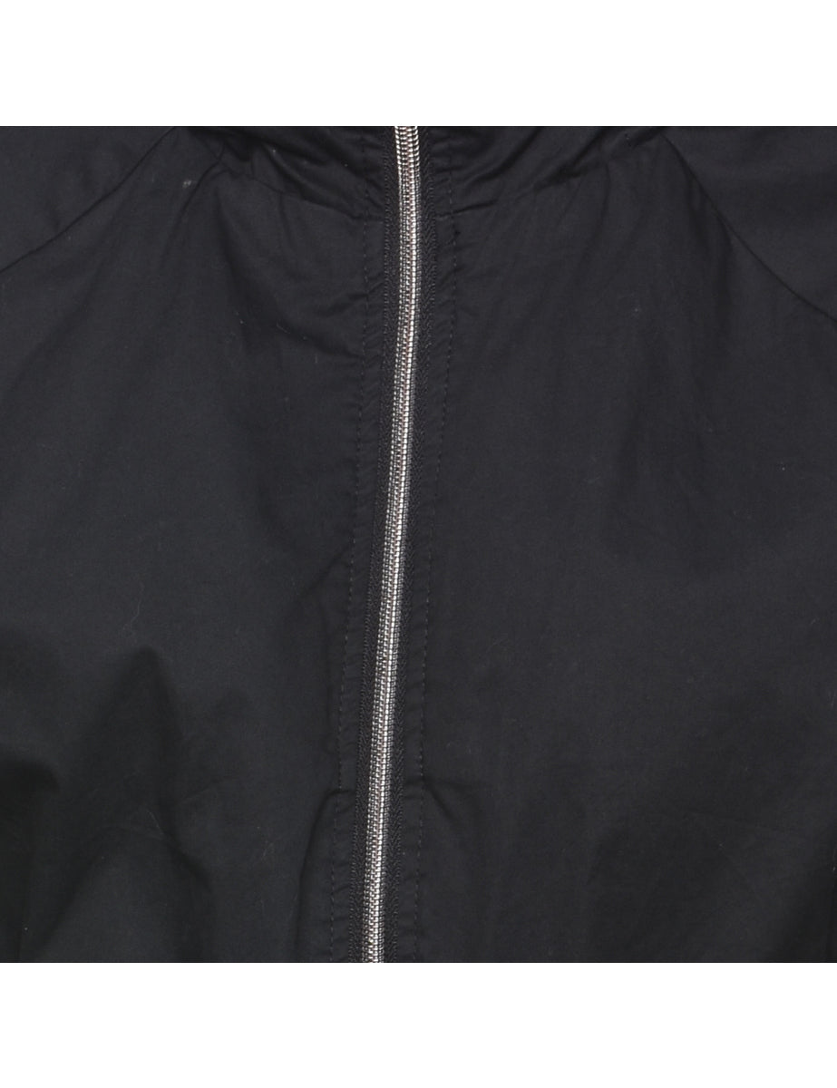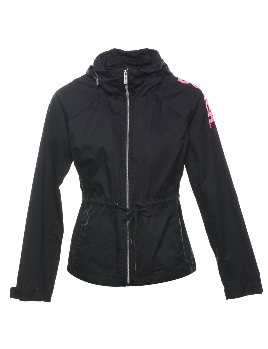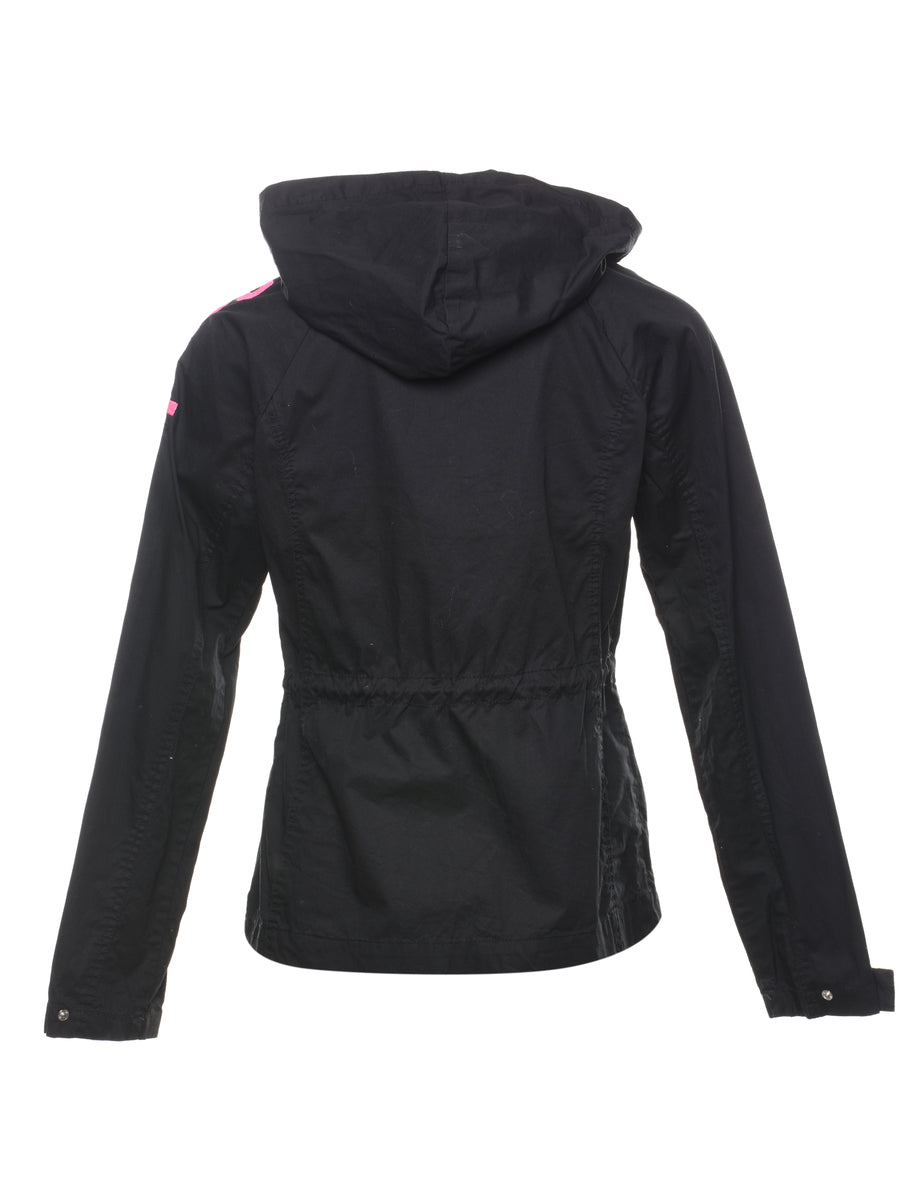 Bench hooded black jacket with contrasting lining and multiple pockets. The size label mentions L but based on the actual measurements we consider it a size S.
