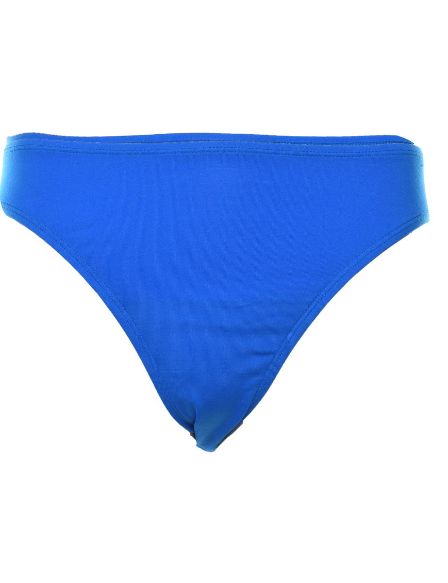 Bikini bottoms in blue with an elasticized waist.