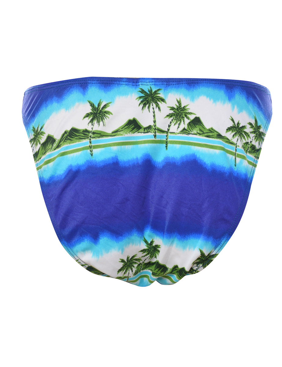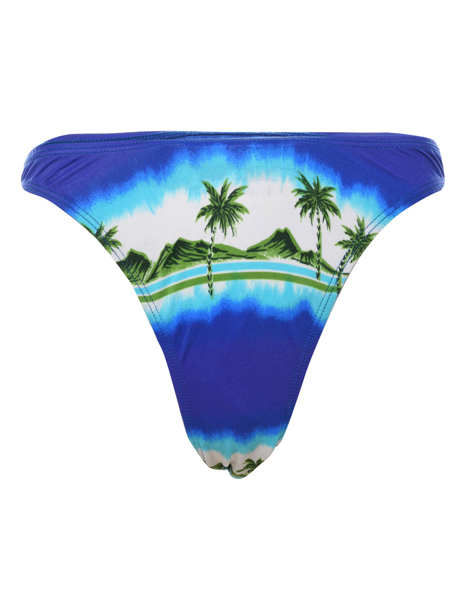 Blue tropical bikini bottoms complete with an elasticized waist.
