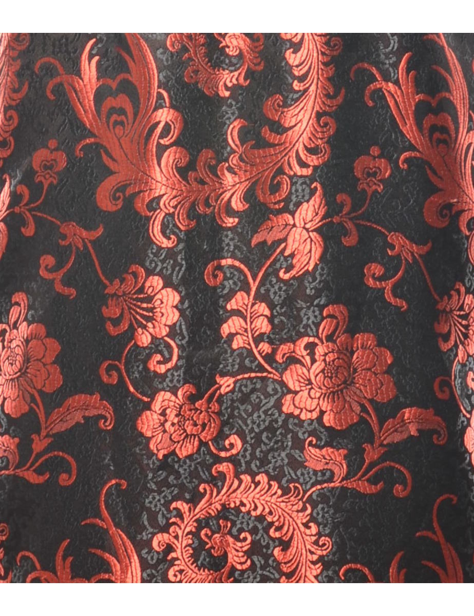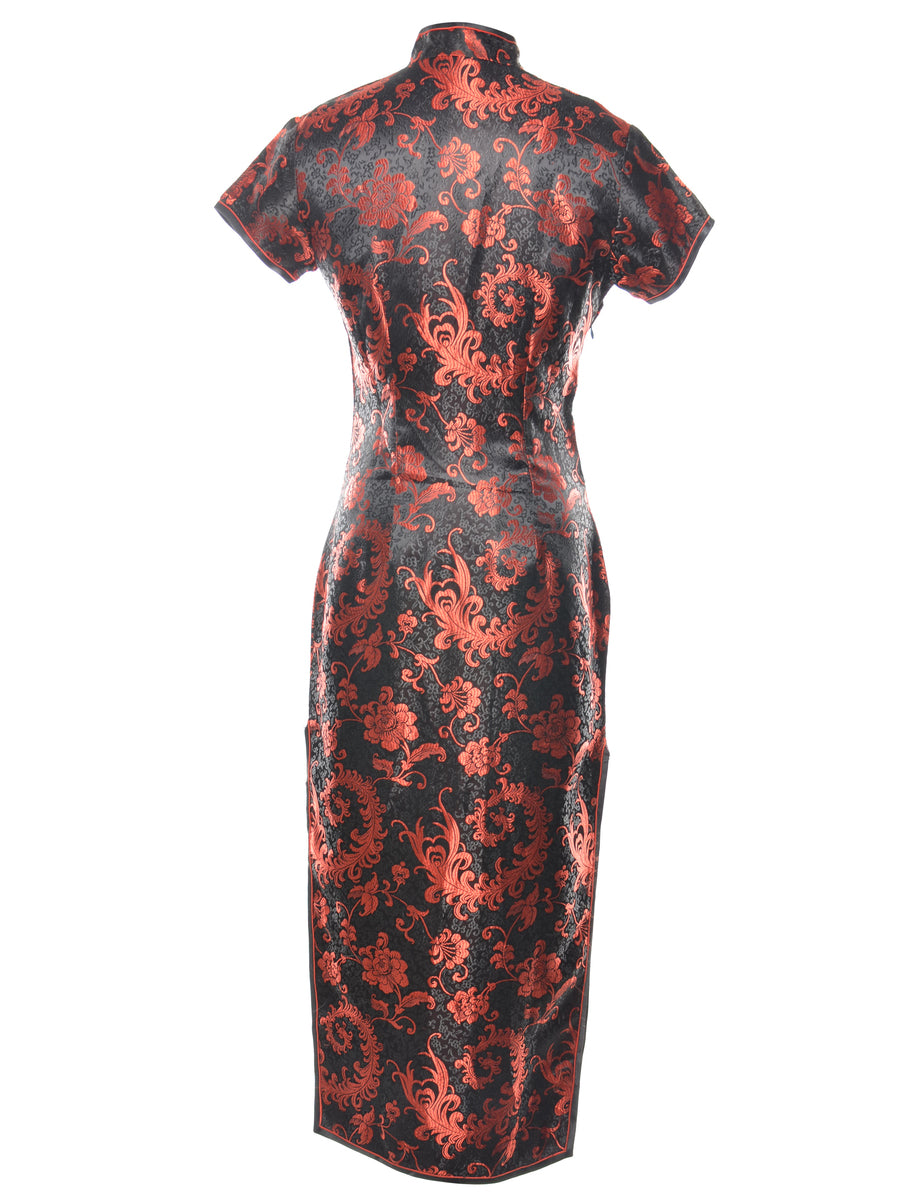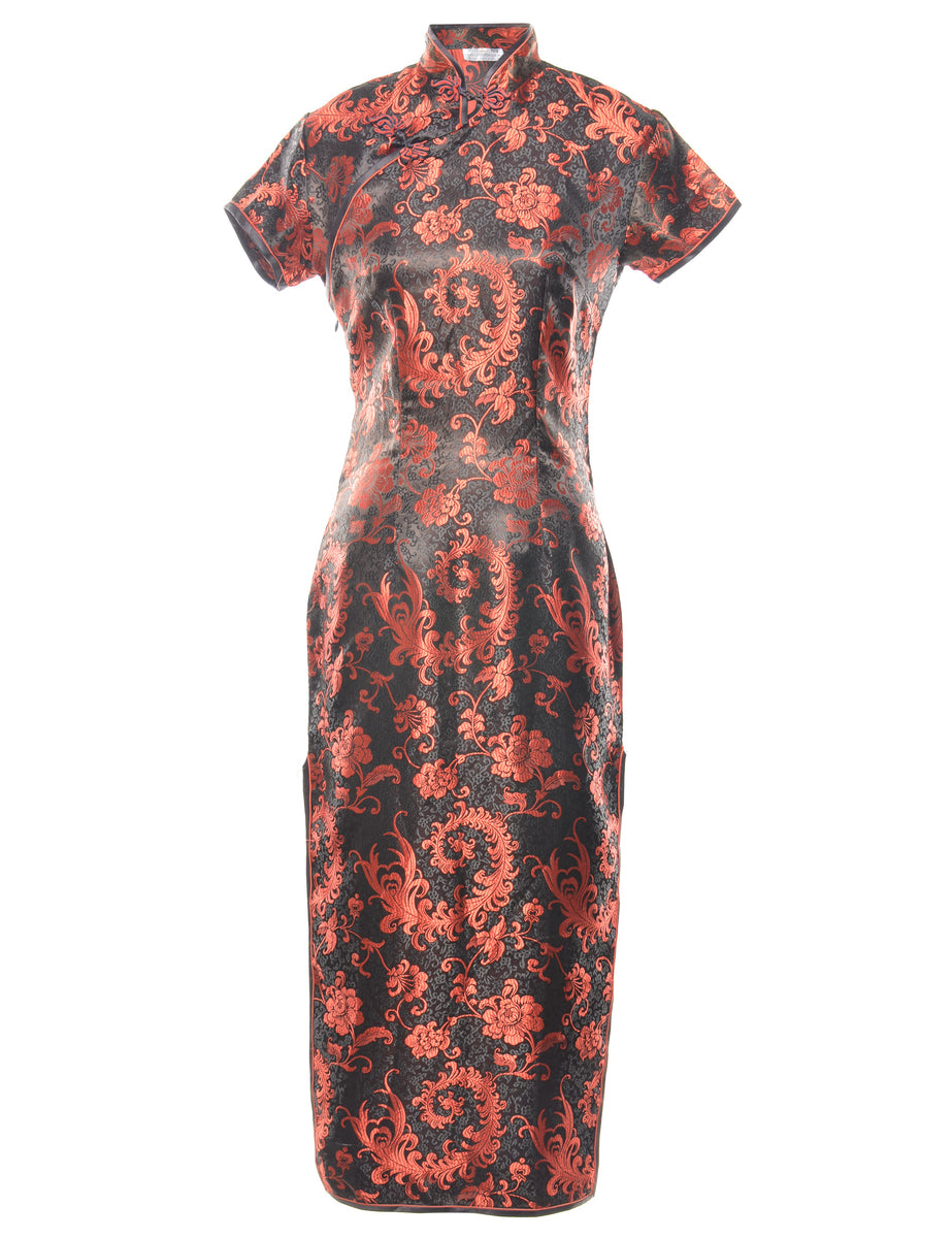 Brocade evening dress with floral pattern. Comes in black with cheongsam collar and side slit.