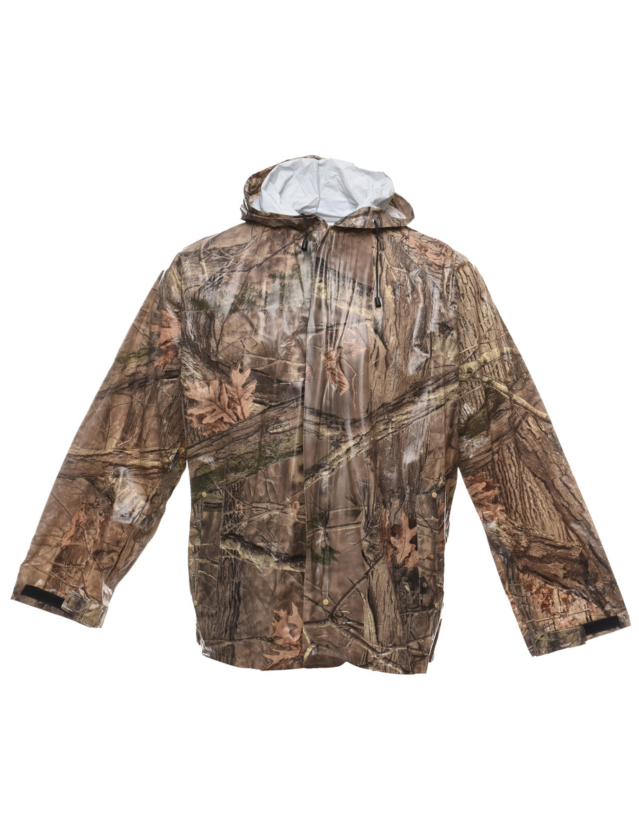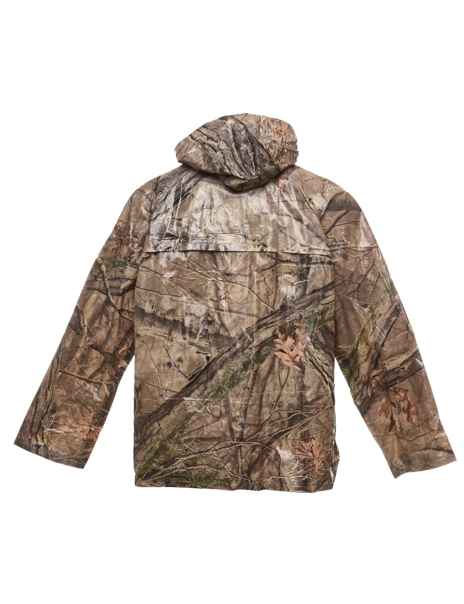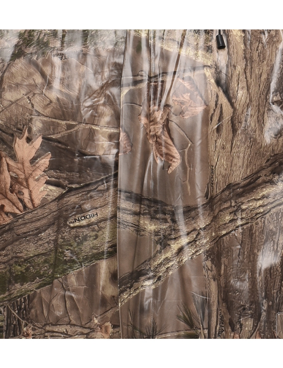 Classic dark green classic camouflage print raincoat complete with a hood.