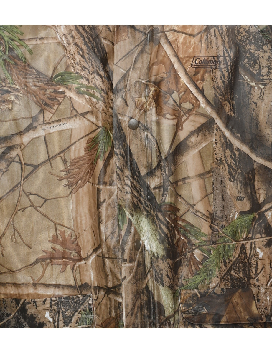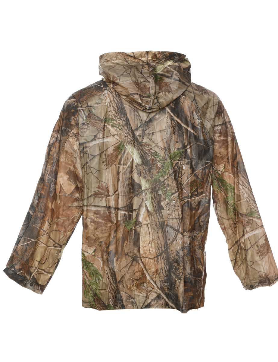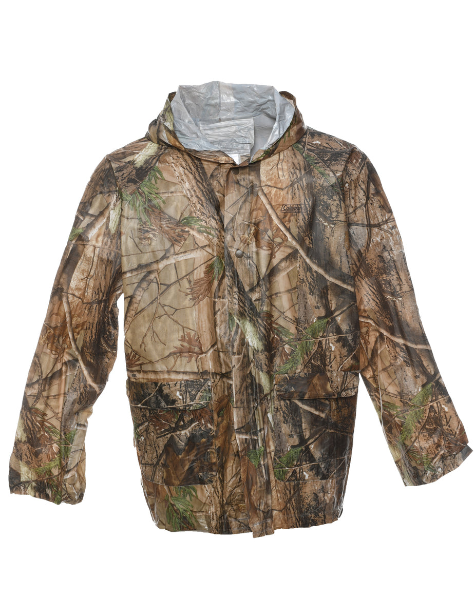 Raincoat in light brown with camouflage print, multiple pockets and raglan sleeves.
