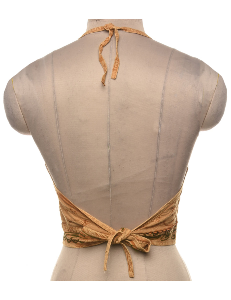 Cropped tank top. Comes in brown with a halterneck and embroidery.