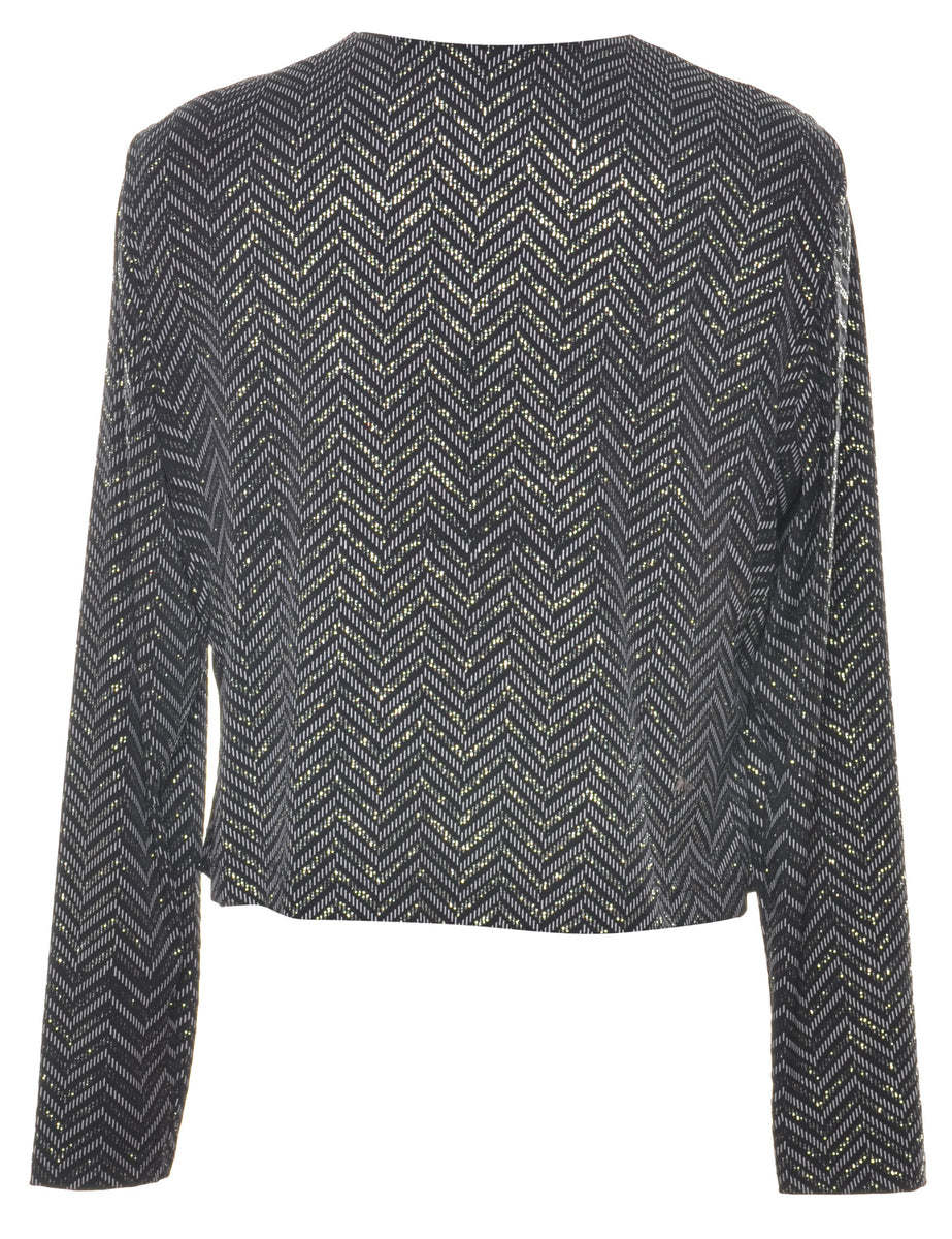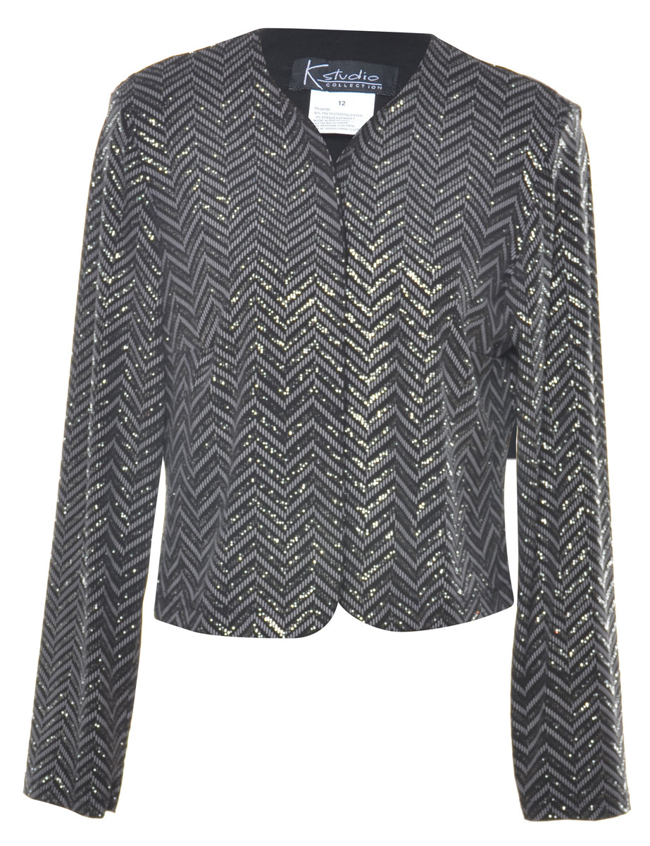 Herringbone tweed evening jacket with metallic finish. Comes in black with removable shoulder pads.
