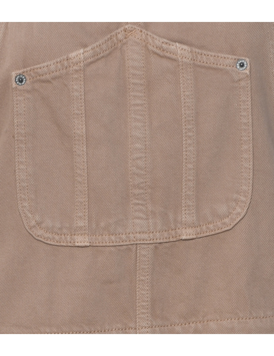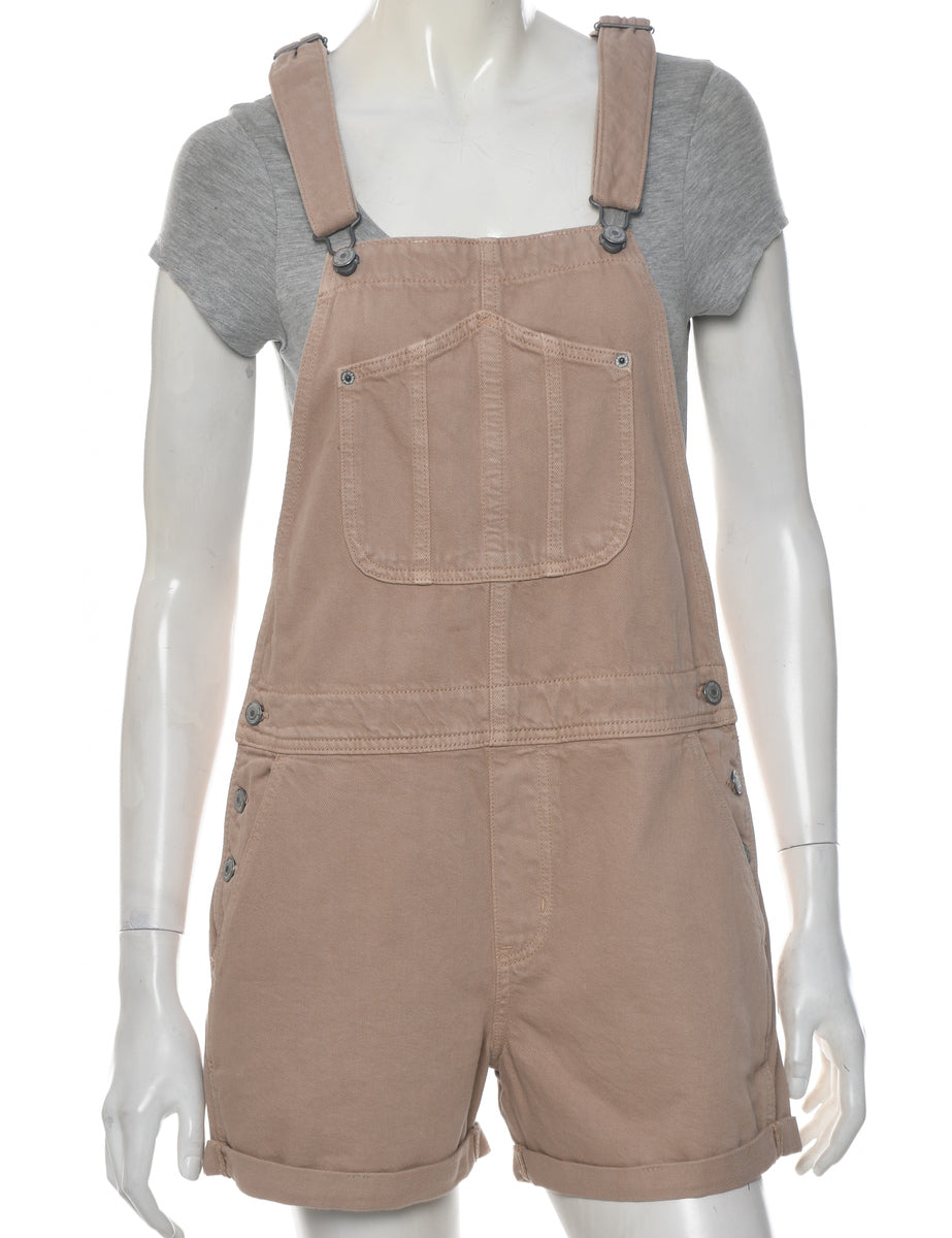 Straight leg cropped dungarees in tan with adjustable strap and multiple pockets.