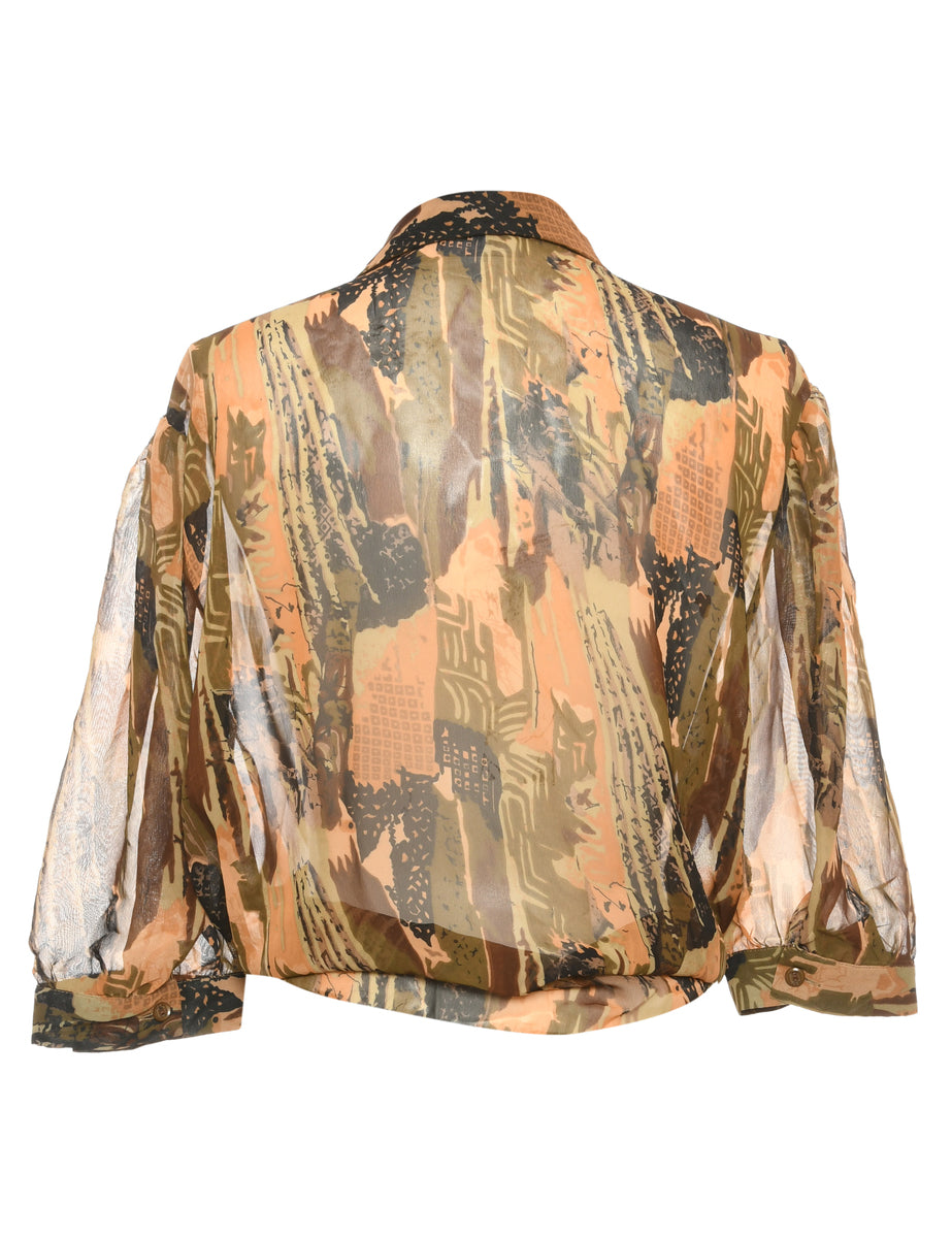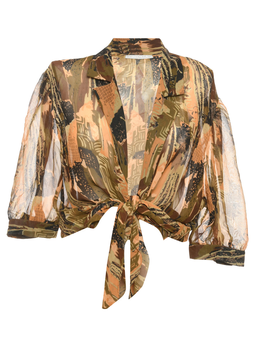 Sheer printed cropped top comes in brown with bishop sleeves.