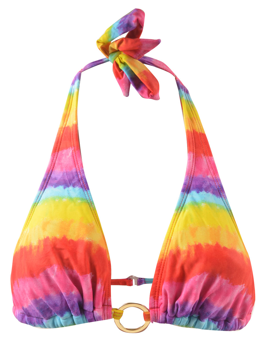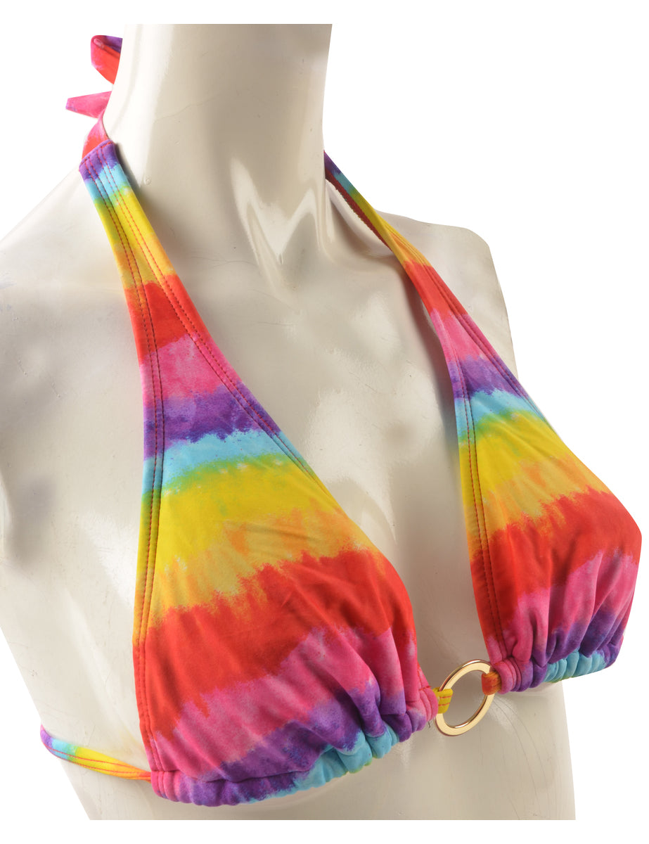 Tie-dyed multi-colour bikini top complete with a built-in bra and a halterneck.