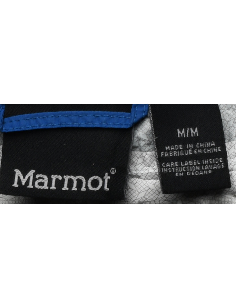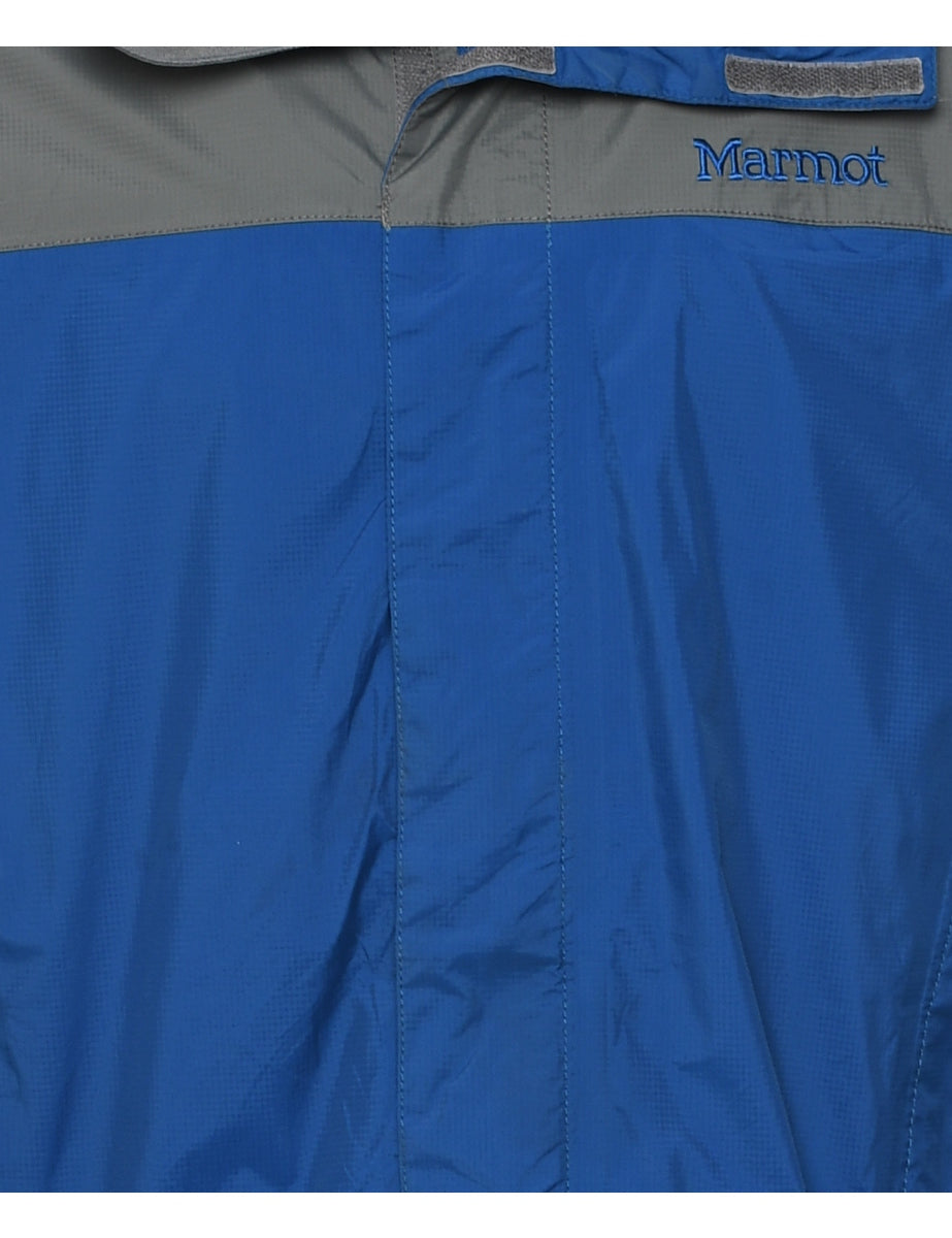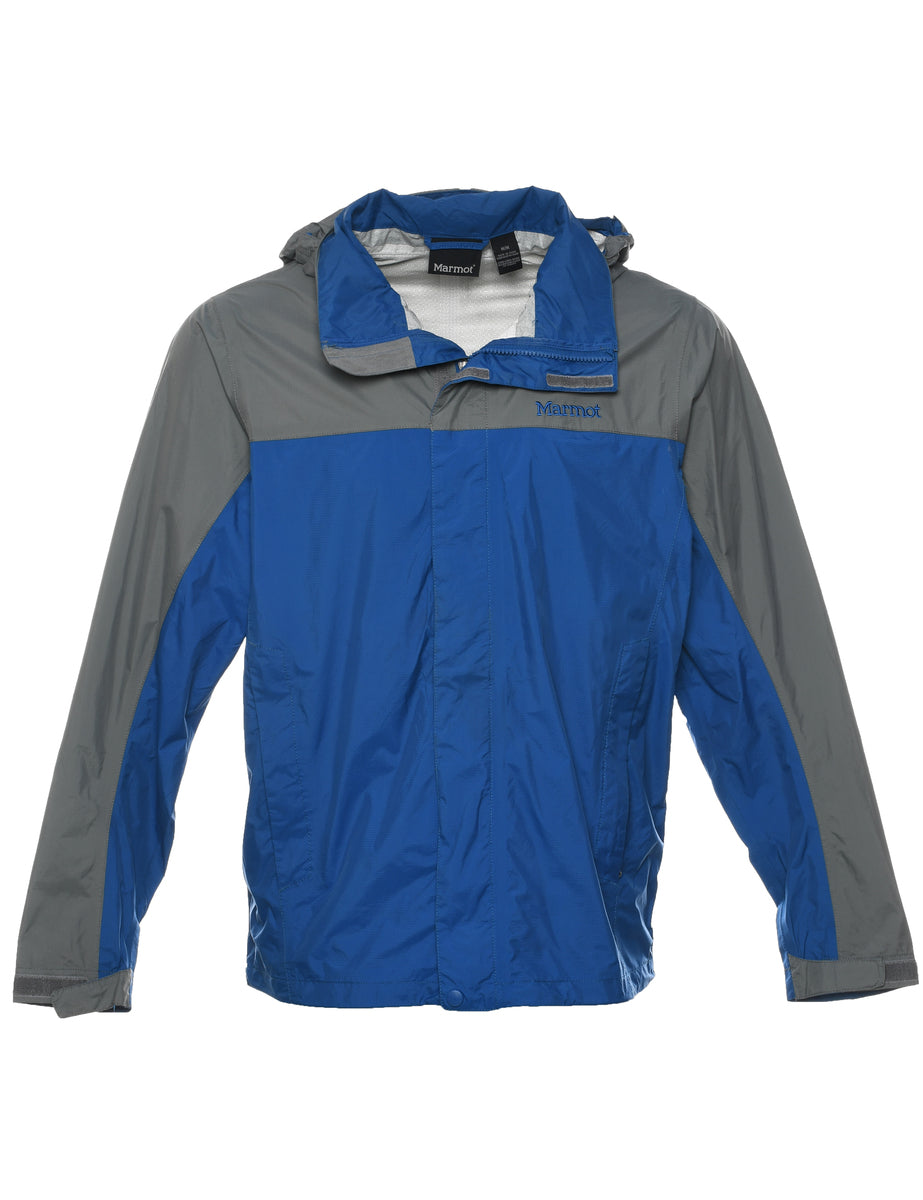 Two tone grey & blue nylon jacket with a hood and multiple pockets.