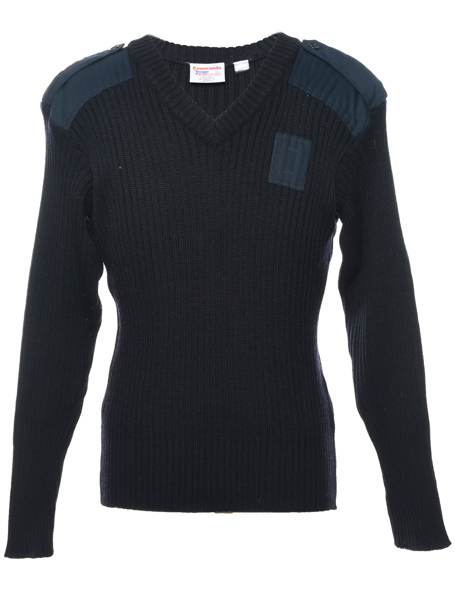 Long sleeved navy jumper with a v-neck and epaulettes.