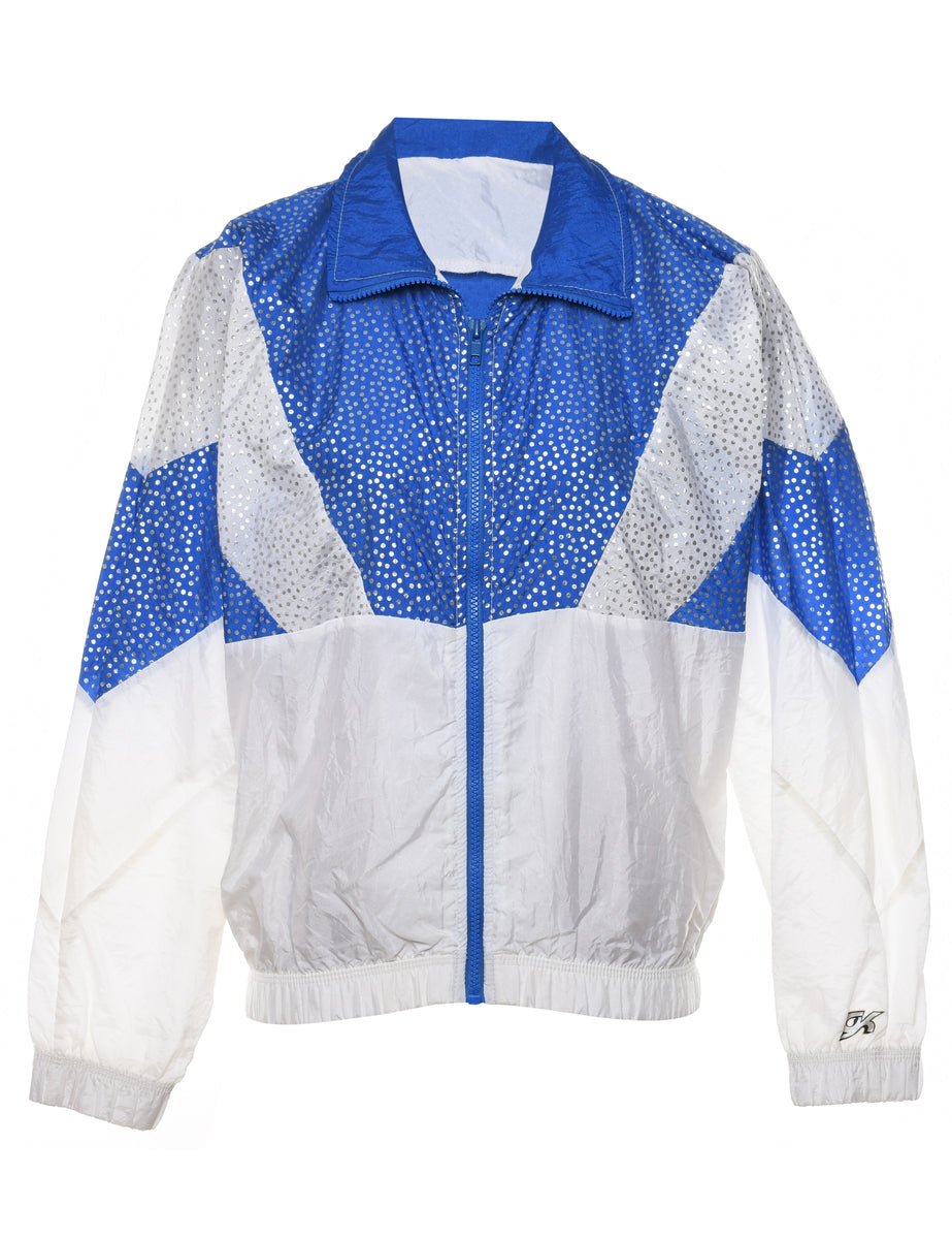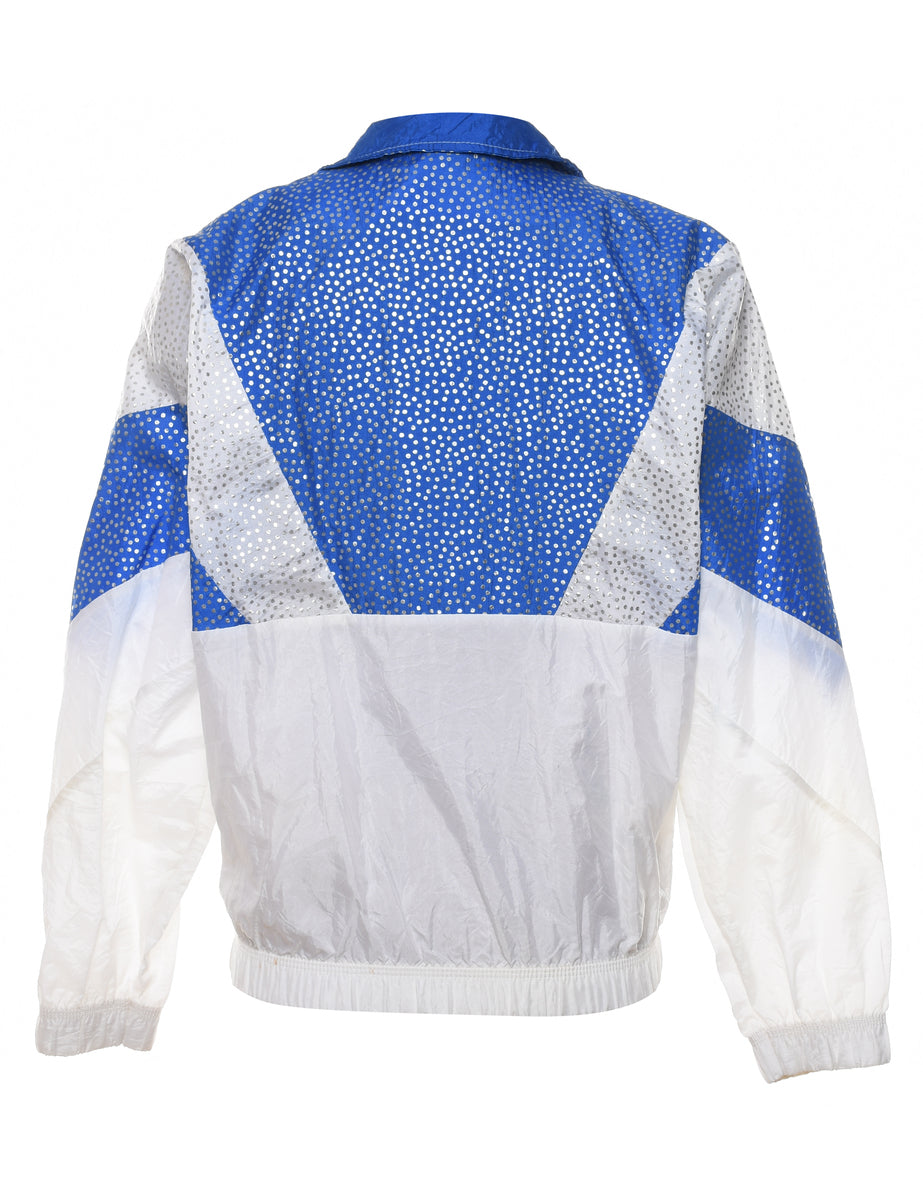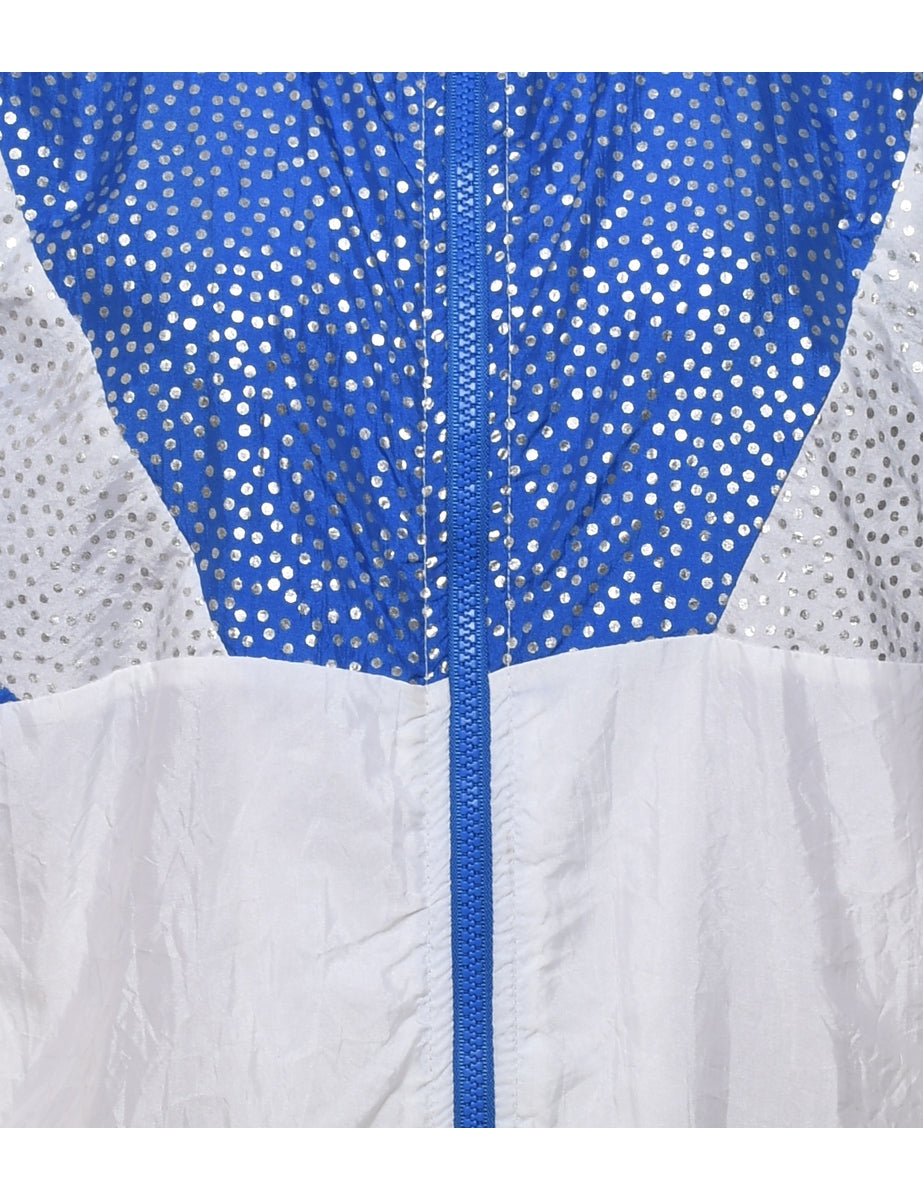 Zip-front white & blue glittery jacket complete with contrasting panels.