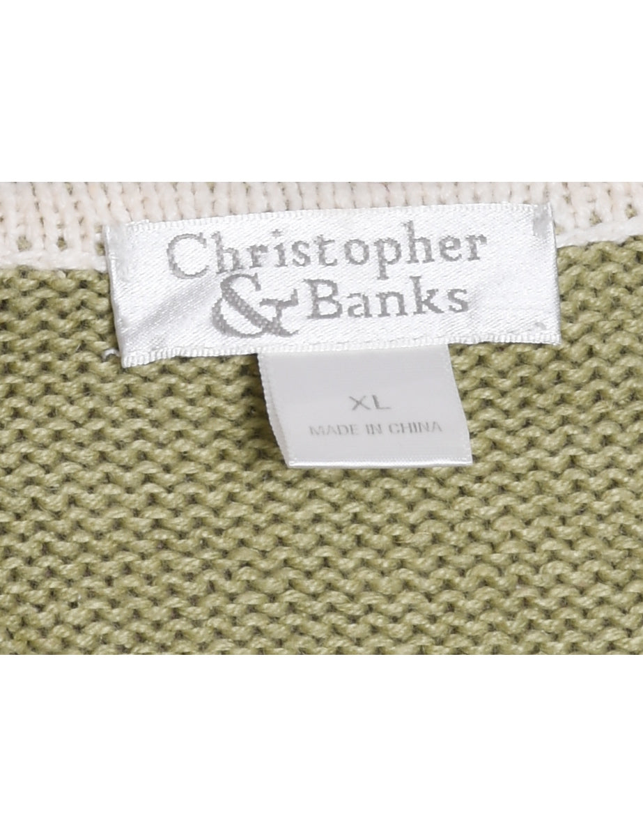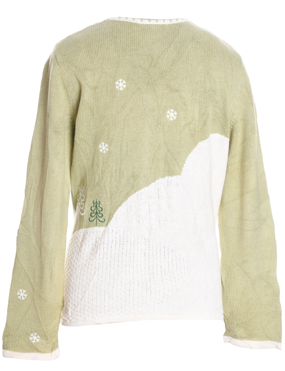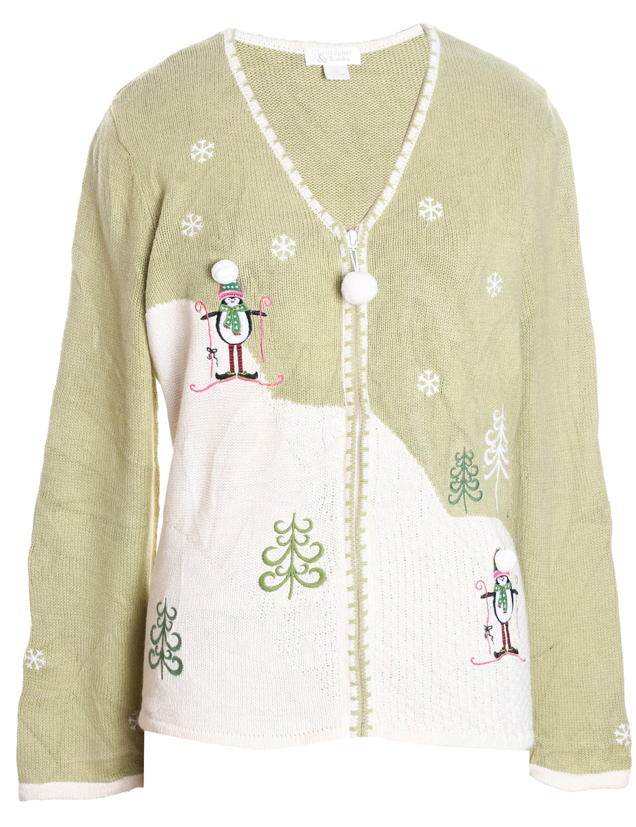 Festive print light green & off white christmas cardigan with a v-neck and embroidery.