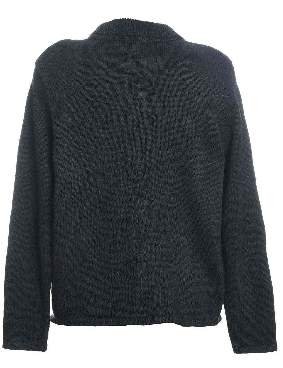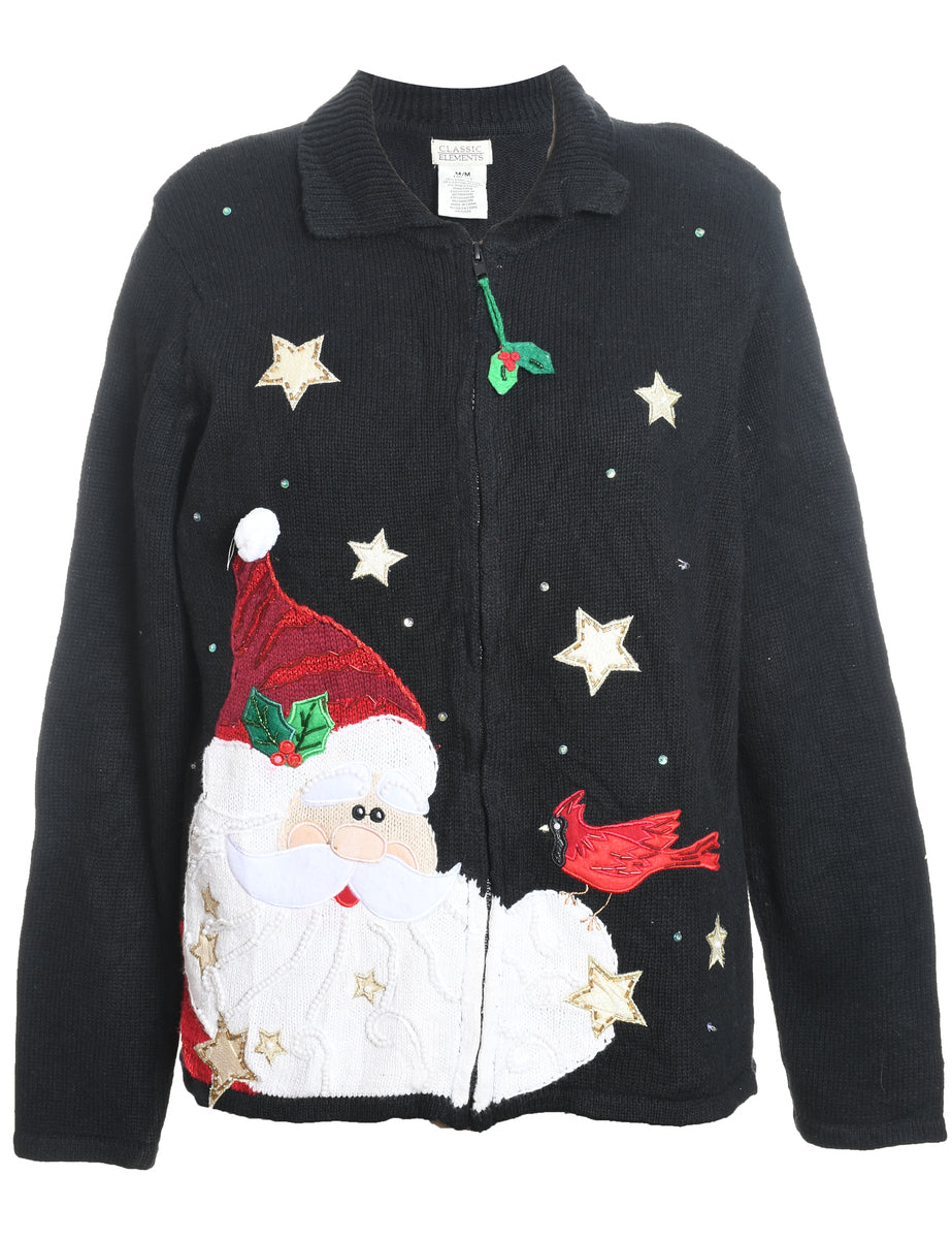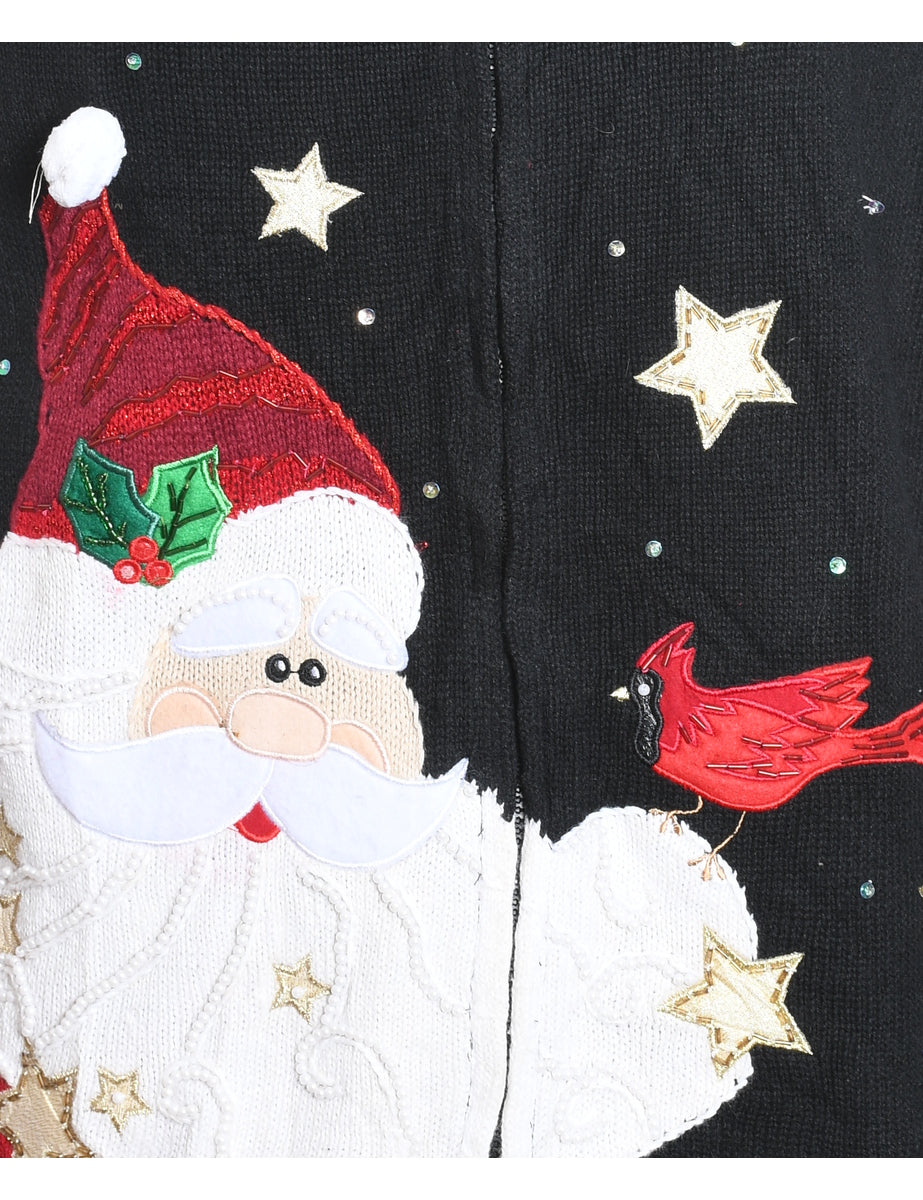 Santa Claus Design Black Embroidered Christmas Cardigan - M