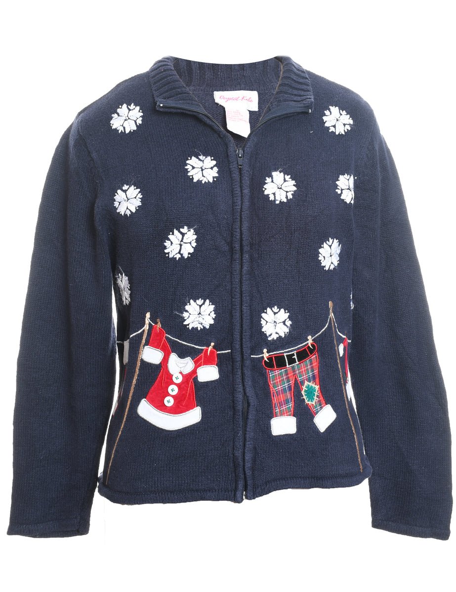 Snowfall design navy zip-front Christmas cardigan complete with an appliqued design.