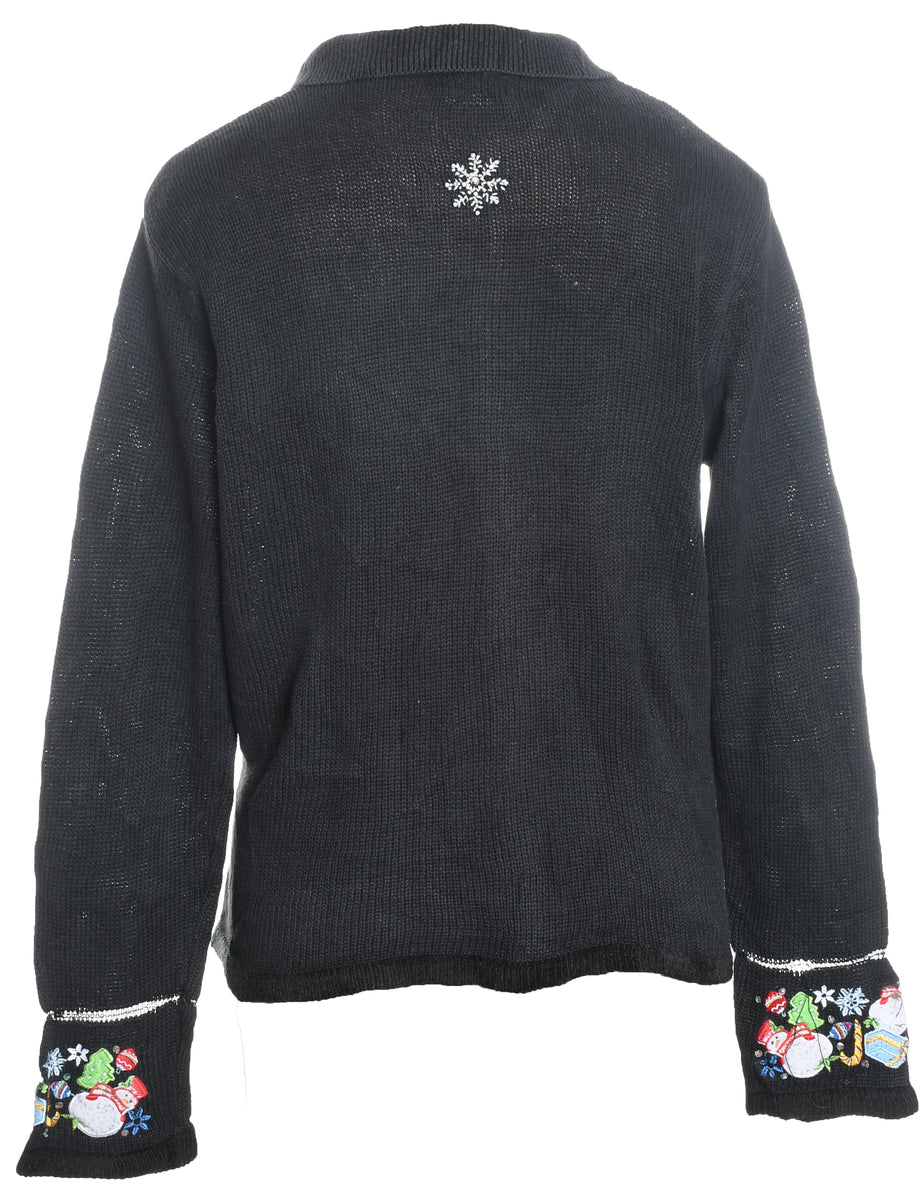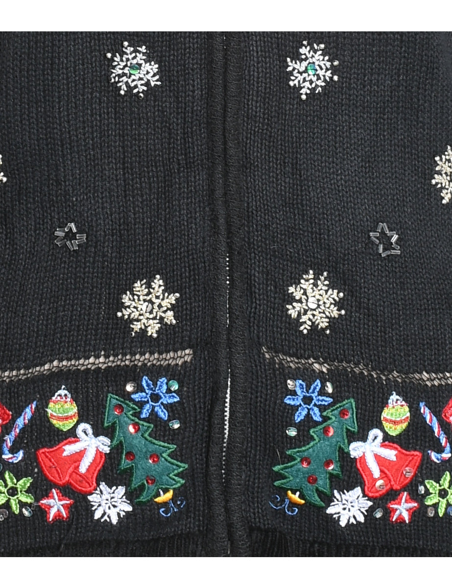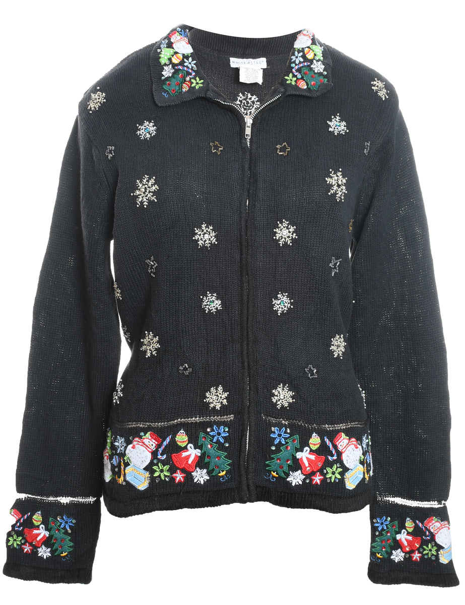 Snowfall Design Black Embroidered Zip-Front Christmas Cardigan - L
