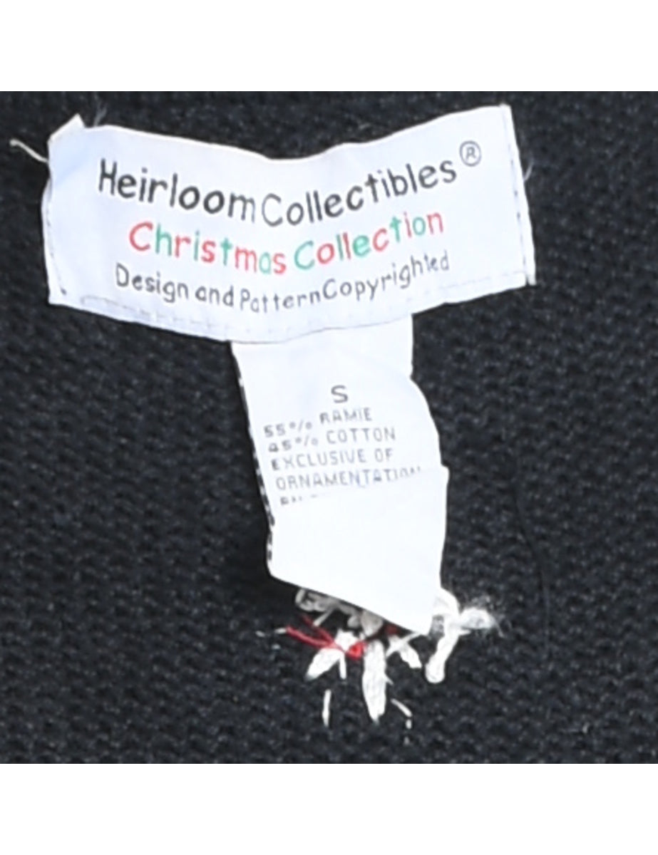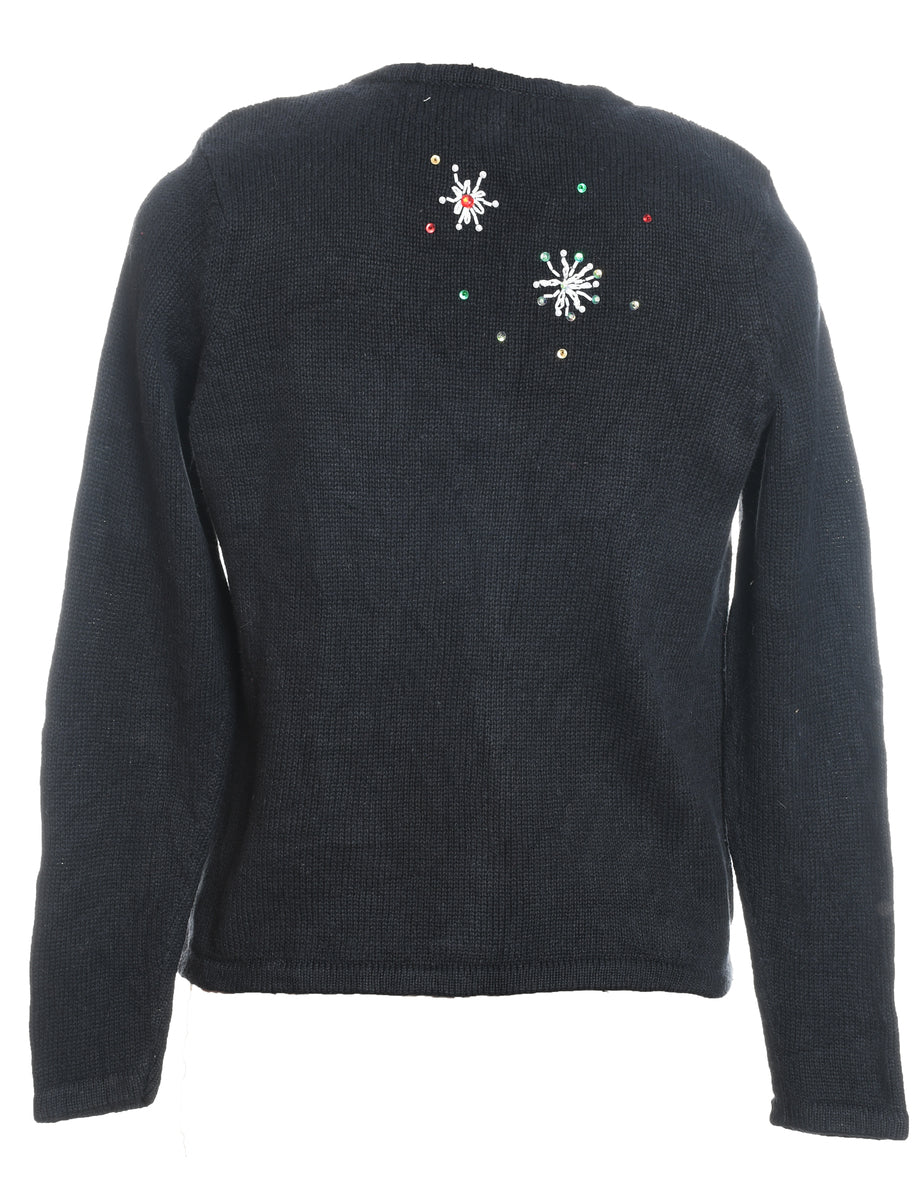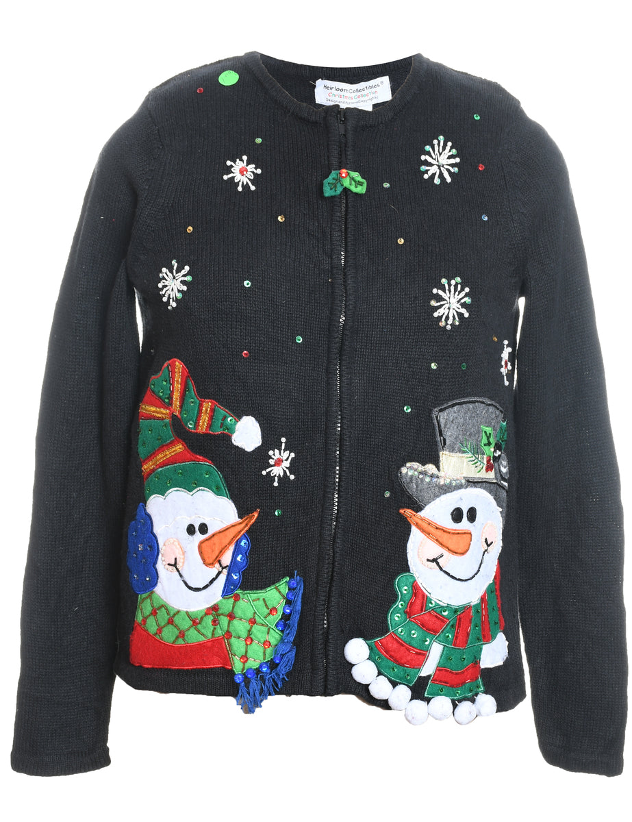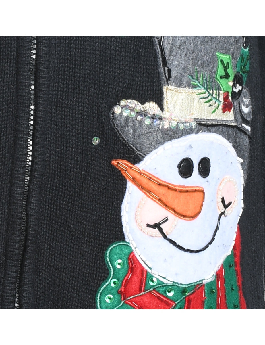 Snowman christmas cardigan in black with an applique design and pom poms.